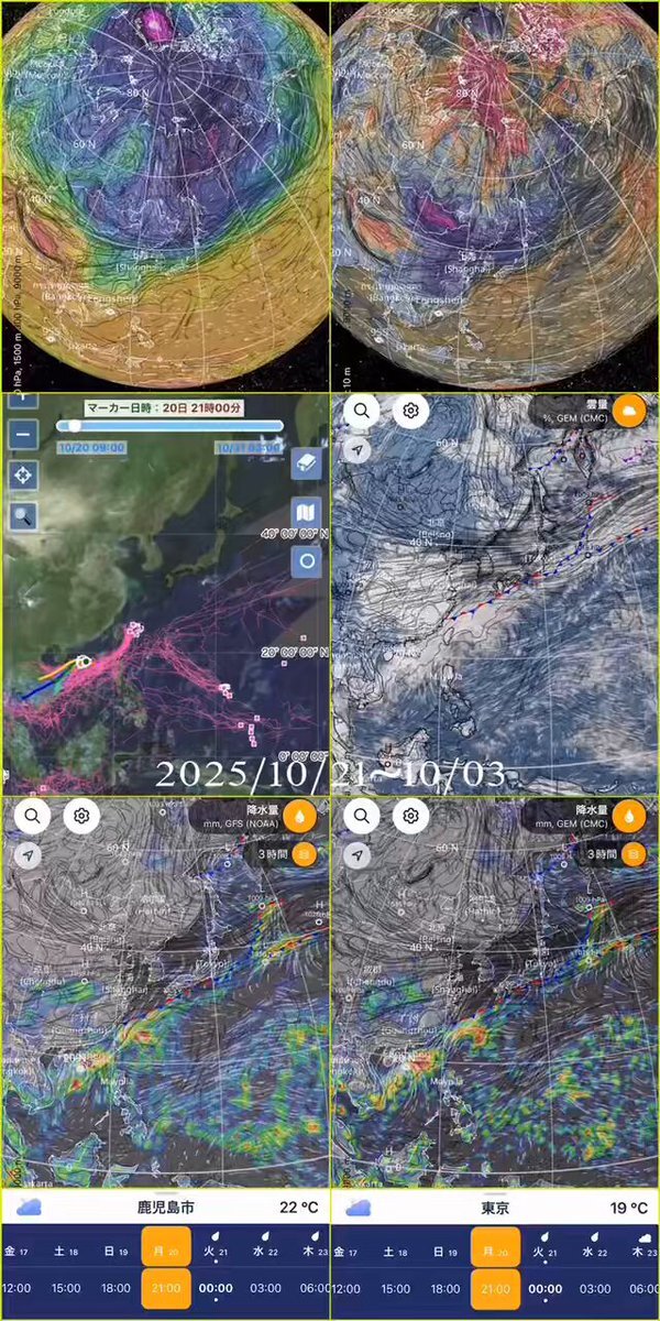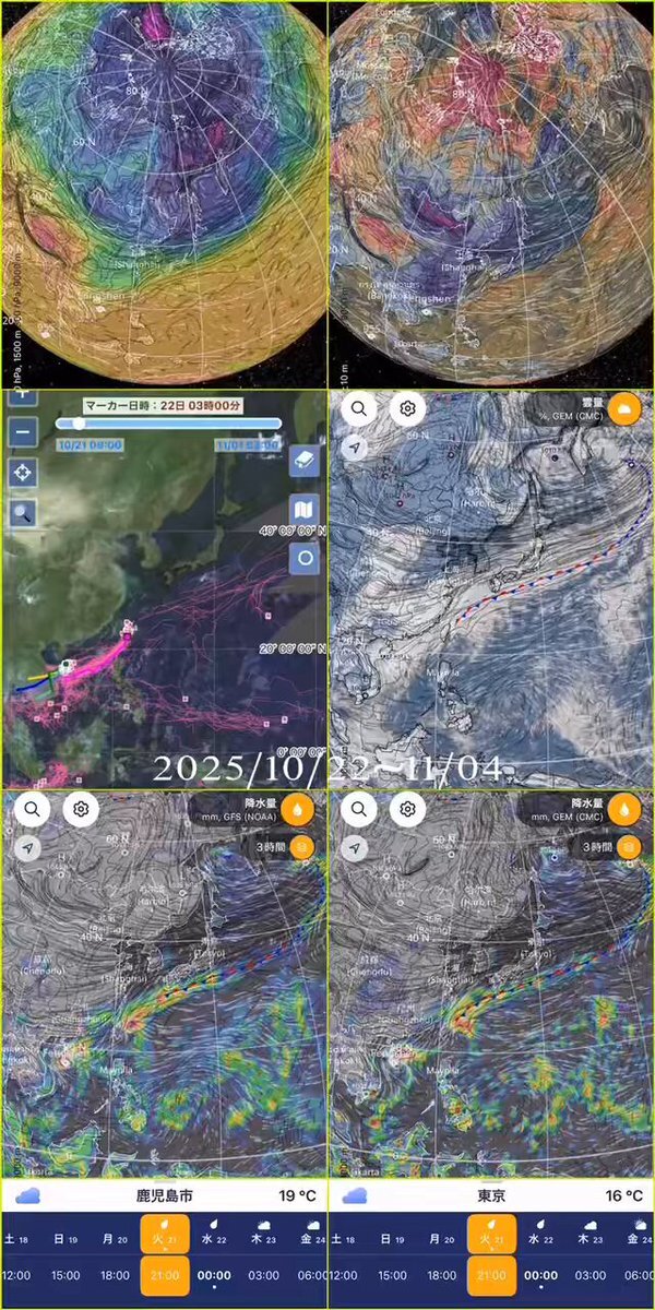2025/10/22~のVentusky.com によるNOAA GFS 1500m寒気 地上温度アノマリー(平年差)、GPV台風進路予測比較 GEM 雲量 GFS + GEM 降水量 。遠隔台風 台風24号 早期台風兆候( #97W 台風25号 ?) 偏西風蛇行 西高東低の冬型 寒気南下 寒波 木枯らし 初雪 前日→ x.com/kishogyotakush… 。 x.com/kishogyotakush…