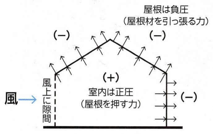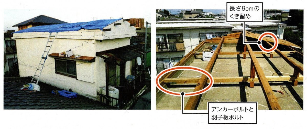 2018年の台風21号では住宅屋根が小屋組みごと飛散する災害が多発しました。 原因1:割れた窓ガラスから強風が吹き込み住居内部の圧力が上昇。屋根を押し出して飛散。左の図参照。 原因2:軽いトタン屋根で風圧に耐え切れずに屋根が飛散。右の写真参照。 画像は日経ホームビルダーより。 pic.x.com/VPhZ5tl1OS
