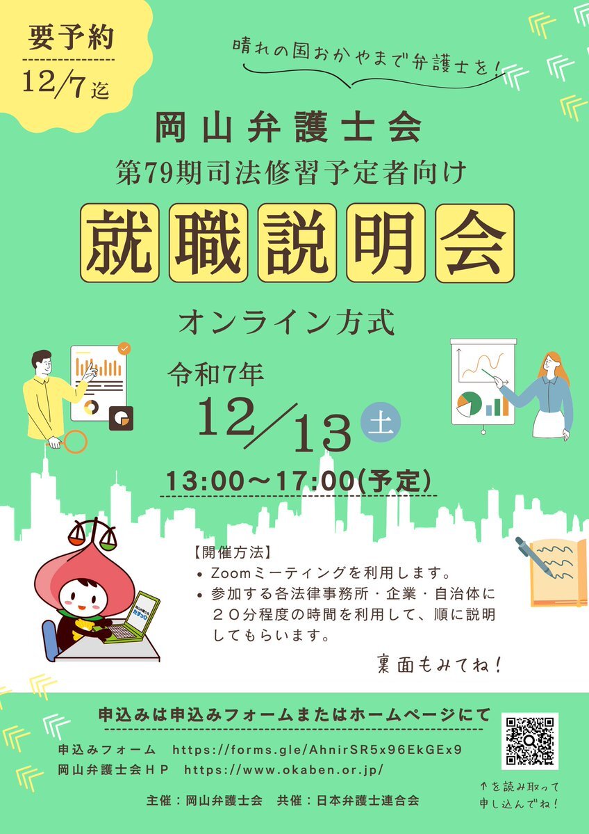 こんにちは☆ 2025年12月13日(土)13:00~17:00にZoomでのWEB会議方式で開催される「第79期司法修習予定者向け就職説明会」のお知らせだよ! 詳細はリンク先から確認してね! okaben.or.jp/event/6247/ pic.x.com/6j0MbJOK2E