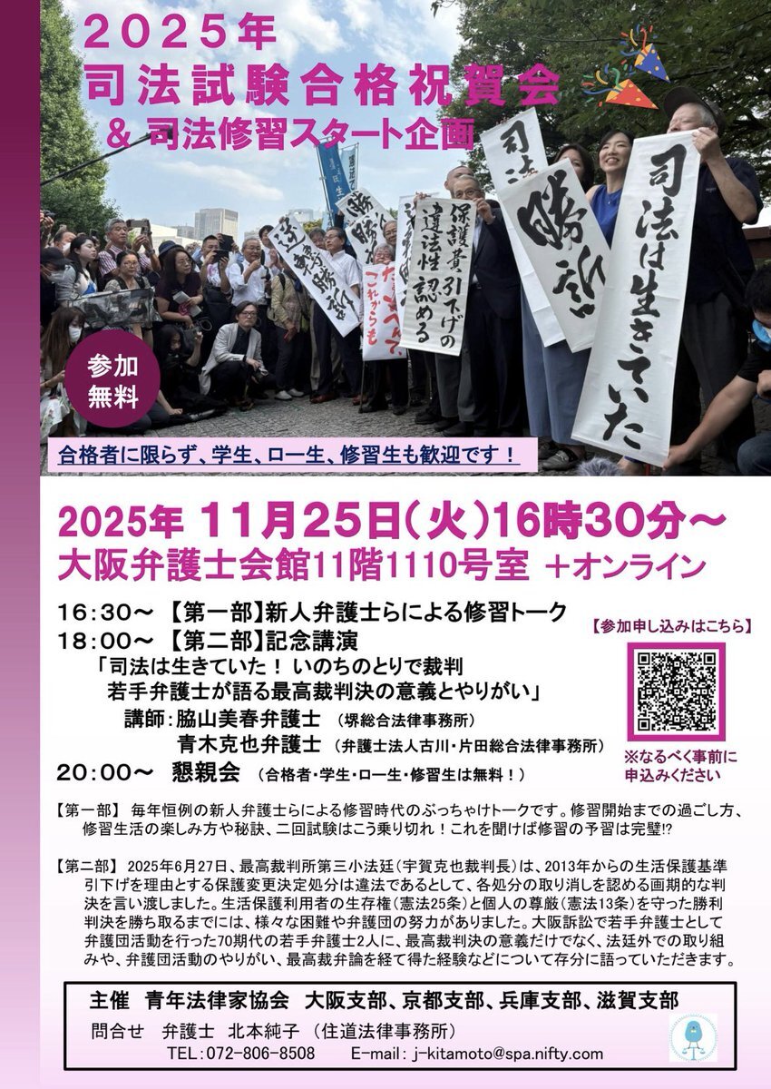 司法試験には合格したけど、町弁の仕事がわからない、内定出たけどええんかな?と思ってる方 弁護士の数だけ働き方はあります 色んな人の話を聞いて、大いに悩んでください! 合格祝賀会&司法修習スタート企画 11.25(火)16:30~ 新人弁護士らによる修習トークと記念講演 forms.office.com/Pages/Response… pic.x.com/br9xcLK4Pq