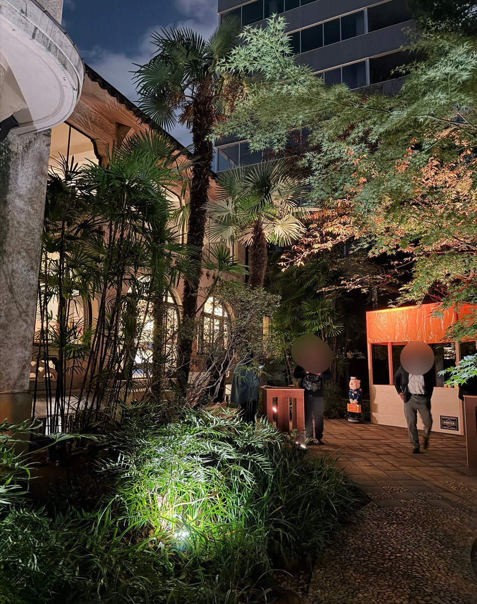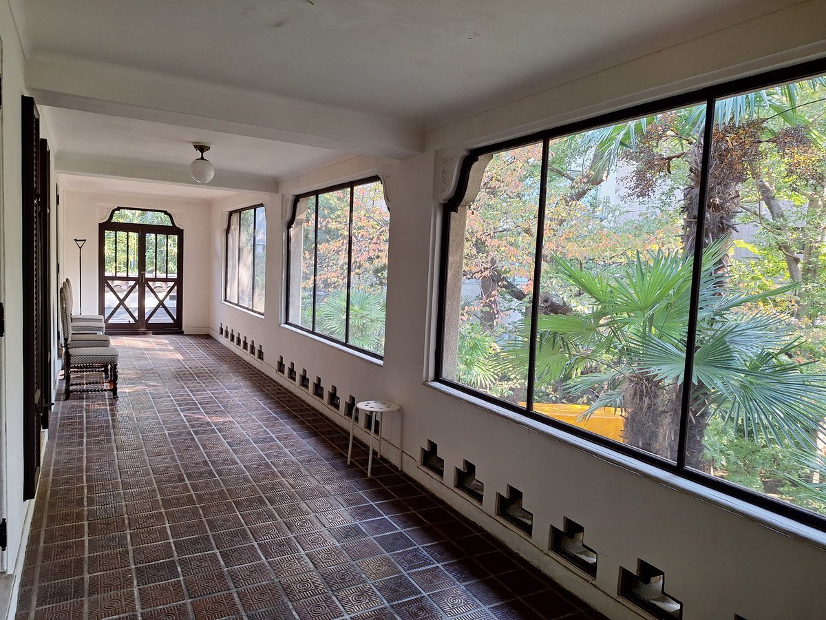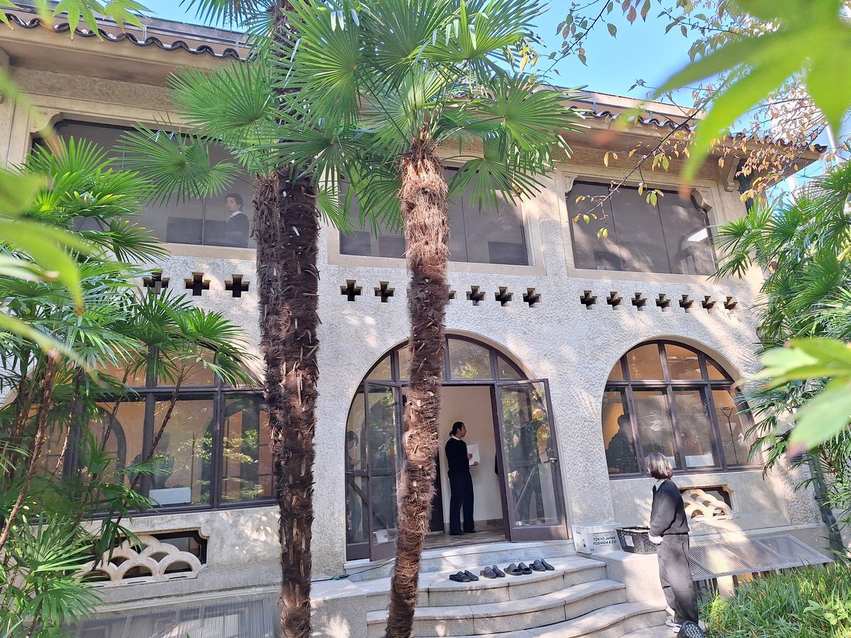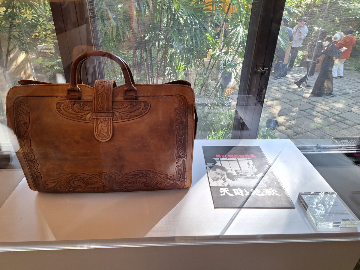 廊下に映画「天国と地獄」のカバン。吉田カバンだったのか。精巧な装飾。一階二階の廊下の窓のアーチから少しだけ紅葉した庭園が見えて美しい。二階廊下は上部隅が内側に曲がった形の窓。下部の凸の連続がかわいい。外から見ると十字の連続なのが面白い。 pic.x.com/1KzIyYIchT