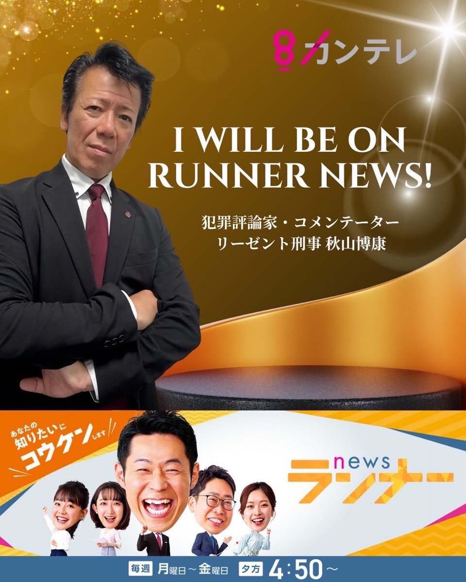 おはようさん👮 今日(11/12)  関西テレビ ニュースランナー に生出演します📺 名古屋主婦殺害事件真相を解説します🫡 #リーゼント刑事 #秋山博康 #関西テレビ #ニュースランナー pic.x.com/U0CLbgscTw