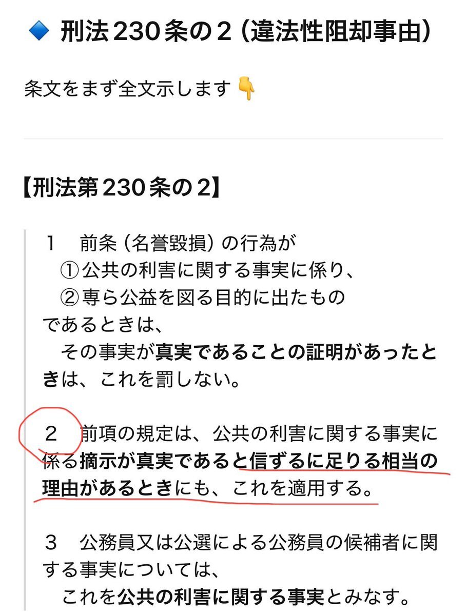 今回は刑法230条の2項死者に対する名誉毀損2項は死者に対して虚偽の事実で無ければ罰しないと書いて有るだから立花氏は真実だと思っていたと主張している!NHK党・立花孝志容疑者、情報は「真実だと思っていた」 接見した弁護士(TBS NEWS DIG Powered by JNN) #Yahooニュース news.yahoo.co.jp/articles/43e04…