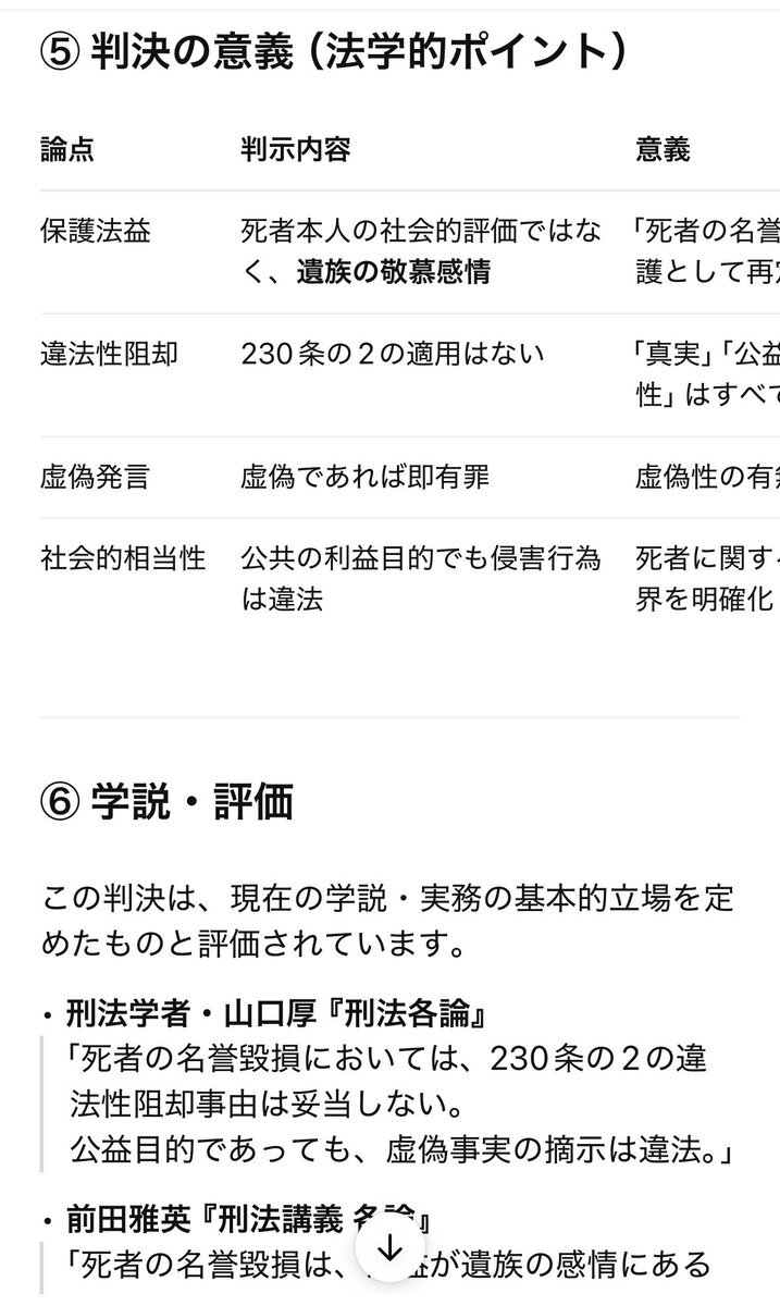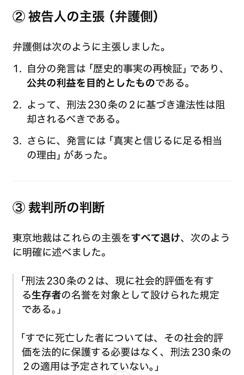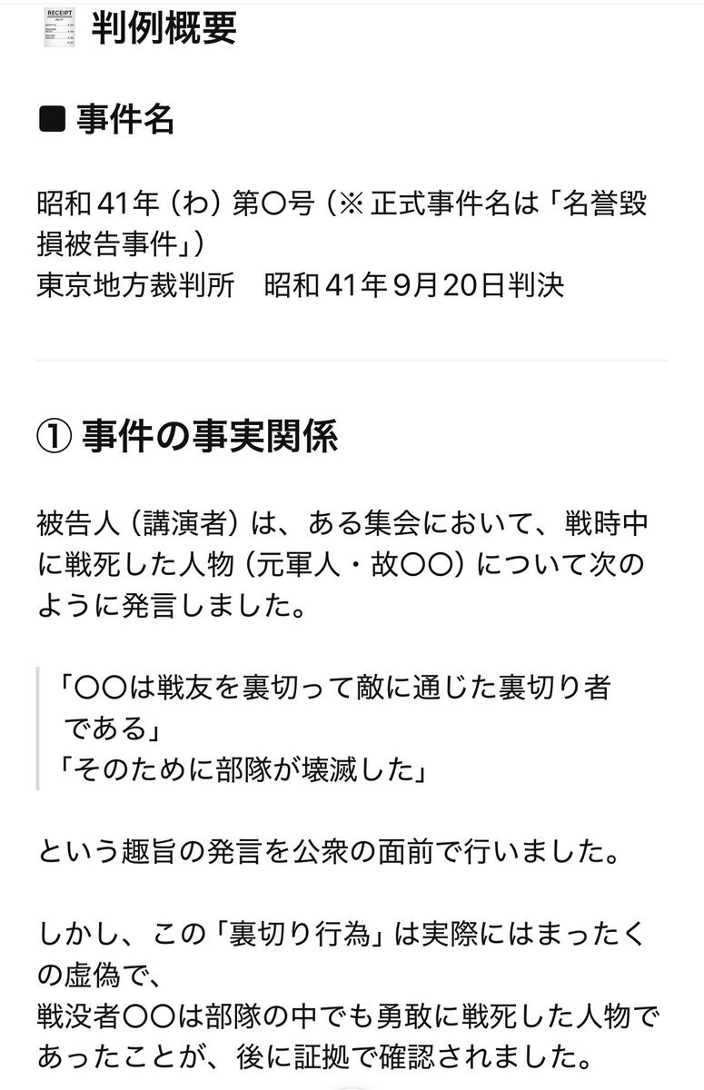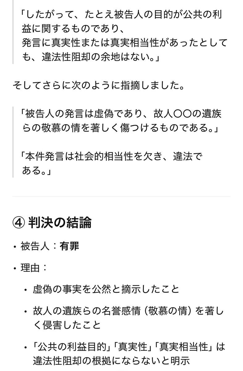 死者への名誉毀損罪には、 生存者への名誉毀損罪に適用される 刑法230条の2の 違法性阻却自由 (公共性、公益性、真実性、真実相当性) は不適用とされた判決例。 pic.x.com/0T5bIDkctT x.com/ellen9294/stat…