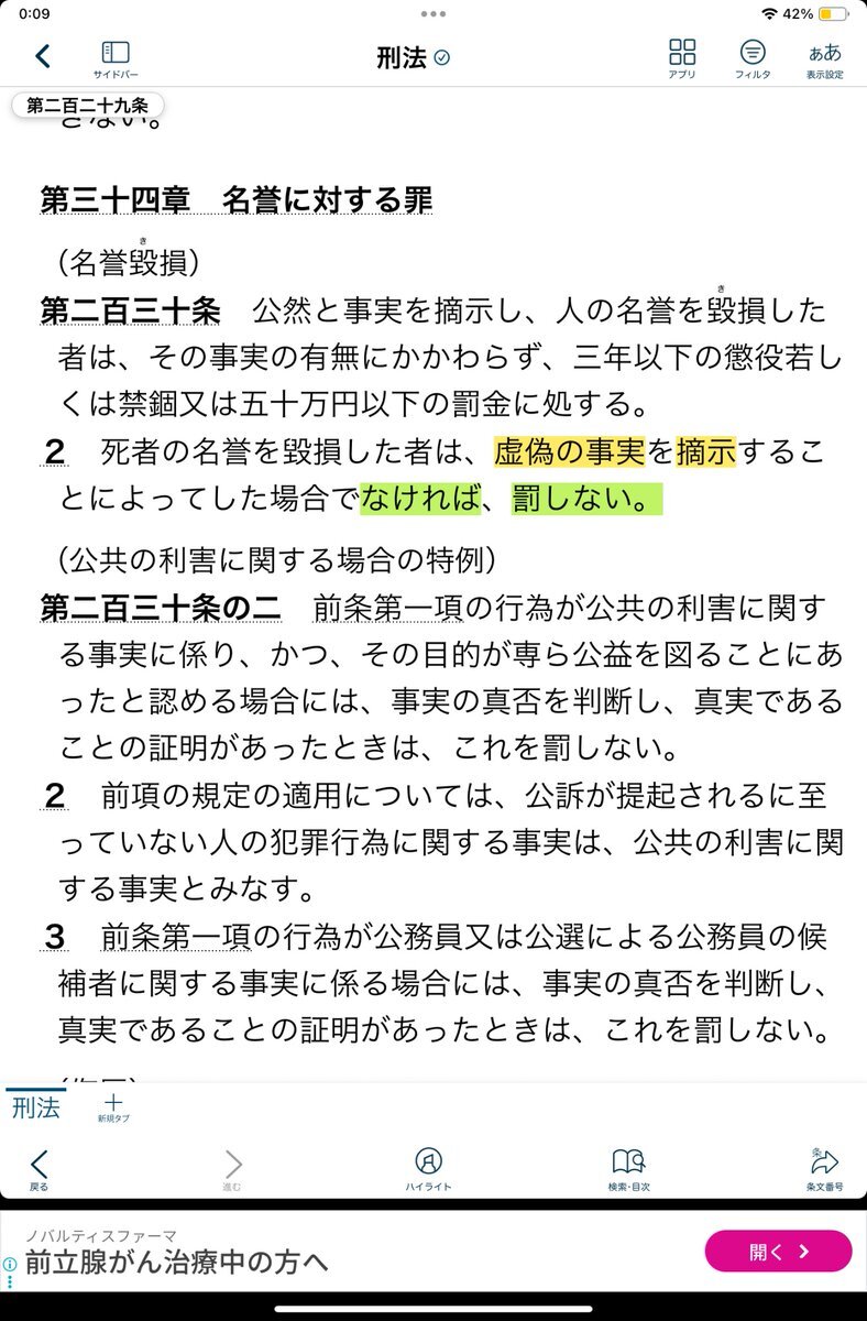 『私自身、ちゃんと名誉毀損に対しての違法性阻却事由があると確信しています』 死者の名誉毀損罪は虚偽の事実を摘示する犯罪なので刑法230条の2の適用による免責はありません 要するに、摘示した事実が虚偽ならば真実性の証明は不可能なので、違法性阻却事由という考え方自体がありません pic.x.com/gNO684O9sF