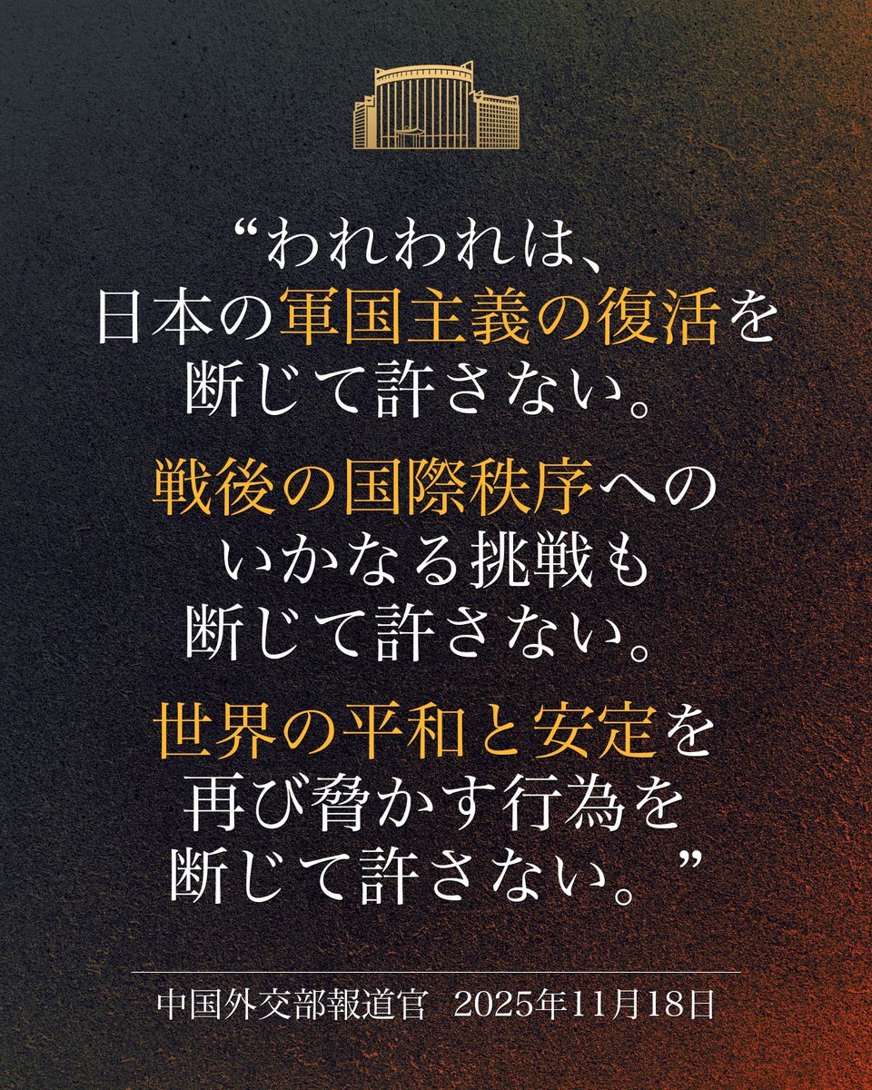 まさに中国政府の主張通りなので、本当に早く対応してほしい。 このままだと日本が本当に立ち直れなくなってしまう。 アジアで争っていても何も始まらない、適切な距離を保ち協力して行くことが、最善の道だと気づいて欲しい。 #高市総理の辞任を求めます #高市総理の発言撤回を求めます x.com/SpoxCHN_MaoNin…