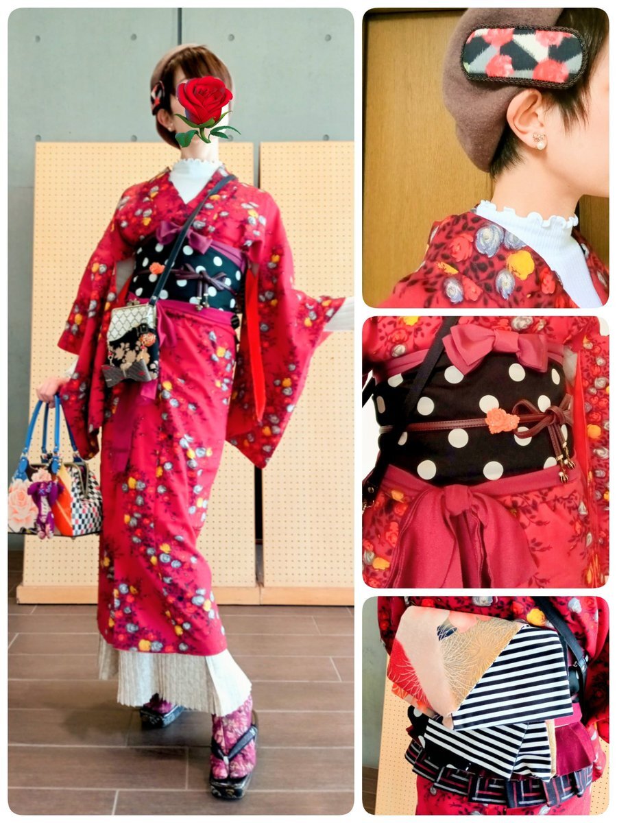 本日のコーデはこちら🌹🎀 大衆演劇を観に行ってきました😀✨ 薔薇の綿着物が着たくて、カジュアルポップな感じの和洋折衷コーデにしてみたよ🤭 🌹アイテムもモリモリ〜🎶 長着 #キモノピクニック 帯留め #和兎庵 バッグ・サコッシュ #ロマンチカ商會 ヘアクリップ #竜胆 足袋 #KIRUkiRu pic.x.com/C1Atxa48xU