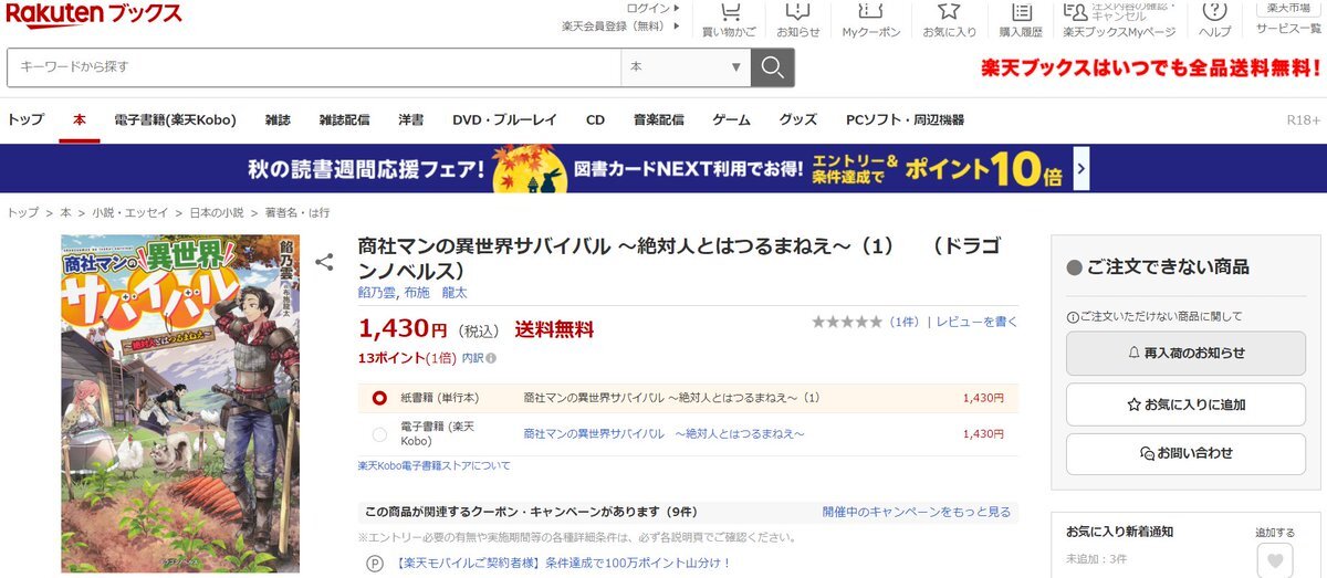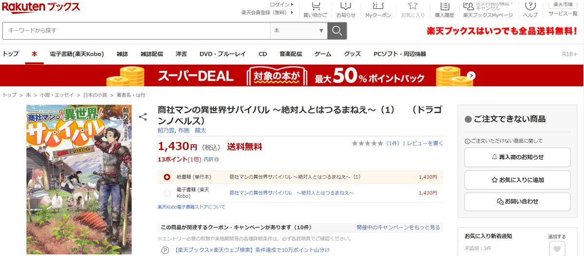 新作と一緒に宣伝していたおかげなのか、拙著💼商社マンの異世界サバイバル💼の小説が楽天ブックス様で売り切れてました。 ・楽天ブックス様 books.rakuten.co.jp/rb/16178994/?l… #カクヨム #KADOKAWA #ドラゴンノベルス #ドラゴンエイジ #小説家になろう #Amazon #楽天ブックス pic.x.com/QhDHHH2ZZ8
