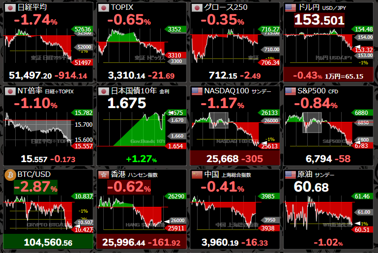 🍰日経平均51,497円 (ー914円) 為替、昼から153円台円高や🇺🇸先物株もマイナスに転じ重荷に SBG、アドバンテ、ファストリの3銘柄でほぼ日経平均の下げ分 日経平均10月は16.6%⤴と月間上げ幅過去最高 月初ということもあり機関投資家の益出し売りも出やすかった 今日から衆院で各党代表者質問論戦