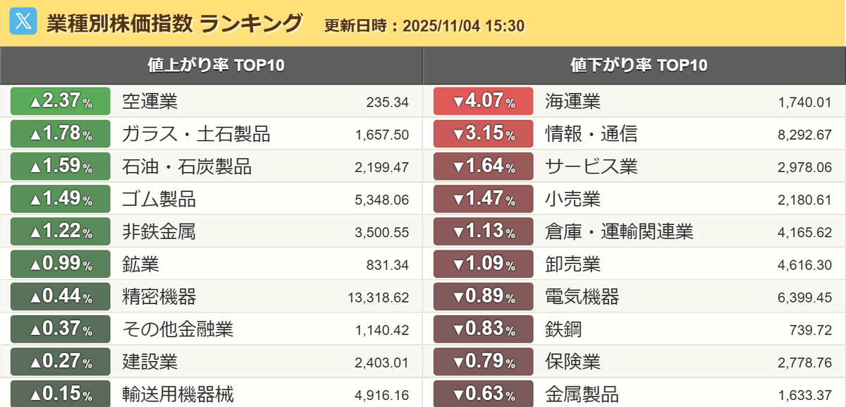 引け乙です ✅#日本株 は反落⤵ ・後場に急落 ✅空運やガラス土石が強、海運や情報通信が弱 ・商船三井が4.93%⬇:12時の決算発表を受け ✅ドル円は153円台前半に⤵ ✅年初来高値:日本電気硝子、日本特殊陶業、日本ガイシ 等 ✅年初来安値:ZOZO、ヤクルト、大東建託 等 pic.x.com/MdZepDdxUy
