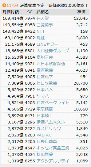 11月04日 「くいたん」で配信予定の決算発表銘柄 [証券コード 銘柄名 前回発表時間] 7974 任天堂 15:30 8058 三菱商事 14:00 9432 日本電信電話 14:00 8002 丸紅 11:00 4689 LINEヤフー 15:30 9104 商船三井 12:00 8601 大和証券グループ本社 11:30 9021 西日本旅客鉄道 15:30 6841 横河電機