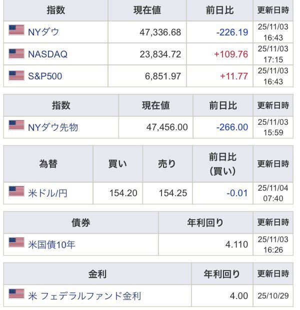 11月4日 ✅日経先物 +110 ✅VIX指数 17.17 ✅1ドル 154.22 ✅🇺🇸三指数 ダウのみ下落 ✅米国債10年 4.110 相場が最高値圏にあるなかで、主力株の一部に調整売り。米経済指標が市場予想を下回ったことも要因。 🇯🇵ではNTT、三菱商事、丸紅、商船三井、などが場中で決算発表😊 今日も楽しみ😊 pic.x.com/CgX2A64BA7
