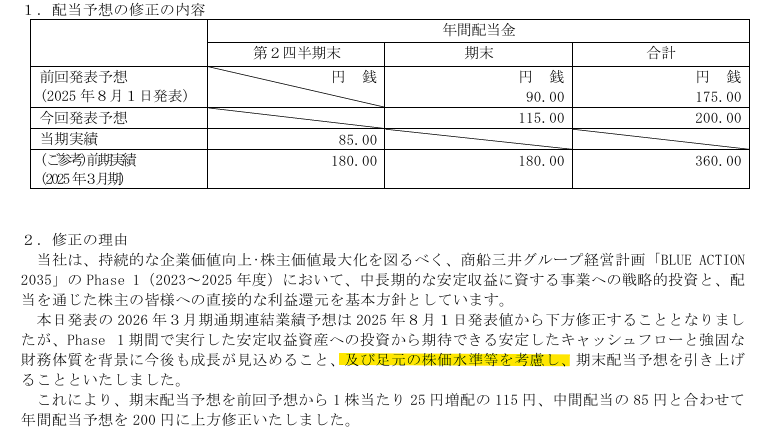 9104 商船三井、中間決算⛴️ ✅2Q累計の経常は前年同期比54.3%減の1146億円 ✅通期の同利益を1700億円→1520億円に10.6%下方修正 ✅今期の年間配当を175円→200円に増額修正