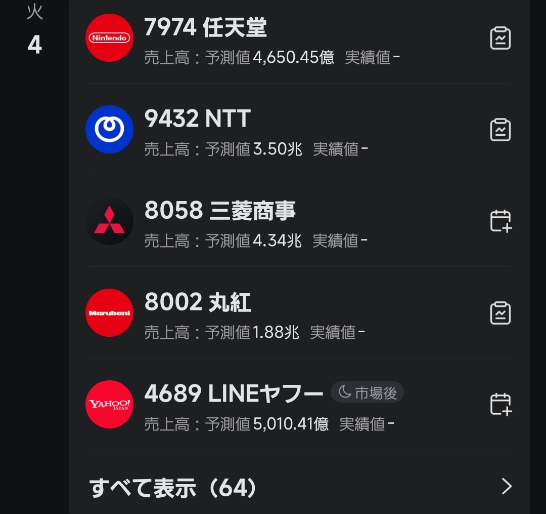 4日の主な経済指標・スケジュール 【国内】 ・決算発表=任天堂 <7974> 、三菱商 <8058> 、NTT <9432> 、丸紅 <8002> 、LINEヤフ <4689> 、大和証G <8601> 、商船三井 <9104> finance.yahoo.co.jp/news/detail/65…