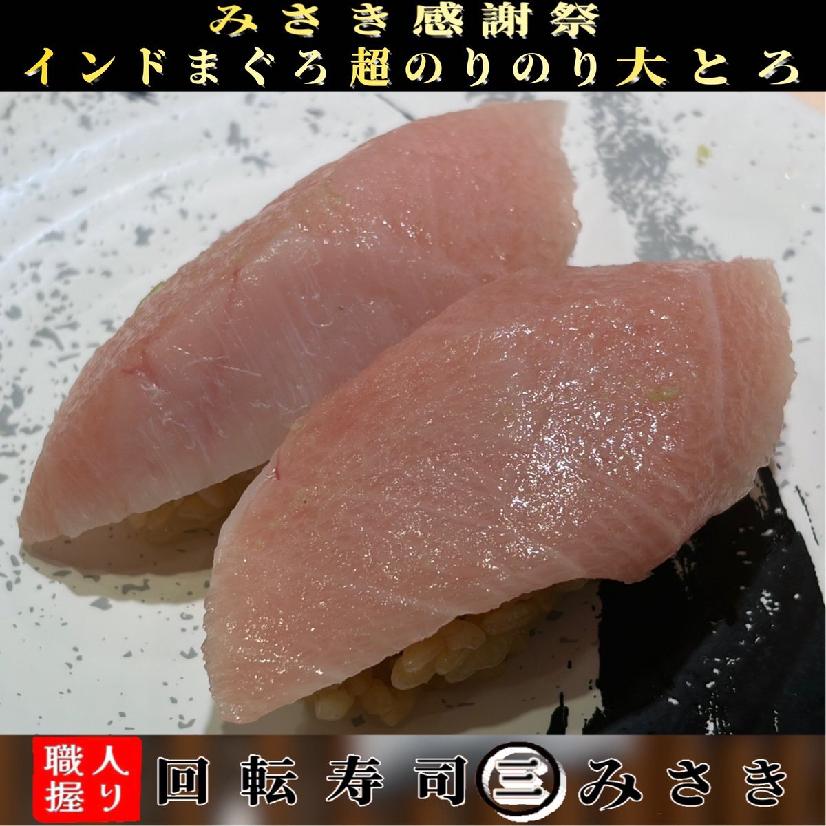 【インスタ投稿で使用したお写真になります】 〔インドまぐろ超のりのり大とろ〕 @kaisen_misakiko 回転寿司みさき様 創業28周年おめでとうございます! ⚠️企業案件ではごさいません 店舗従業員様に、インスタ投稿したいことをお伝えてしております。 pic.x.com/MshbrV5nTd x.com/mizomicchan/st…