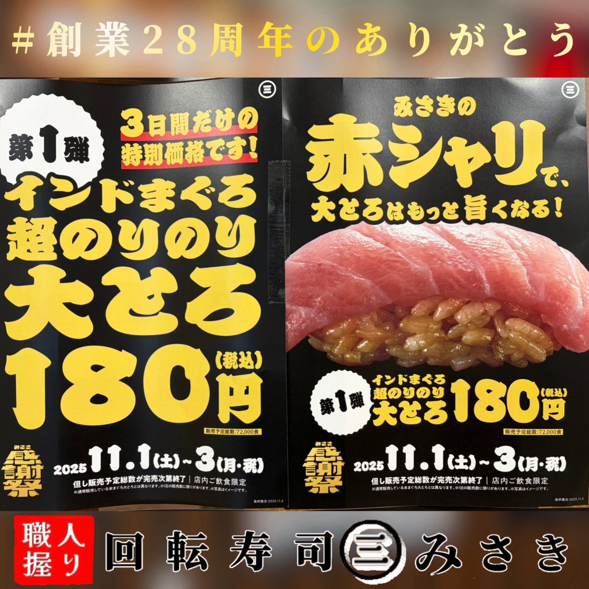 instagram.com/p/DQk6cDKkrF8/… #天使のぱくぱくタイム #Vインスタグラマー #回転寿司みさき #職人握り 〔職人握り〕回転寿司みさき 【みさき感謝祭】 期間:2025年11月1日(土)~3日(月) 〔第1弾〕インドまぐろ超のりのり大とろ 詳細はインスタ見てね💕 #みさき創業28周年のありがとう