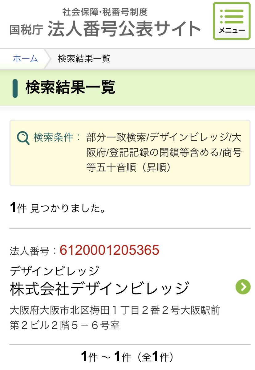 返信先:@aomurasaki_ll国税庁法人番号公表サイトでひっかかる、大阪府のこの名前の企業は一つだけでした houjin-bangou.nta.go.jp 検索条件: 部分一致検索/デザインビレッジ/大阪府/登記記録の閉鎖等含める pic.x.com/gfWCPaVy6B