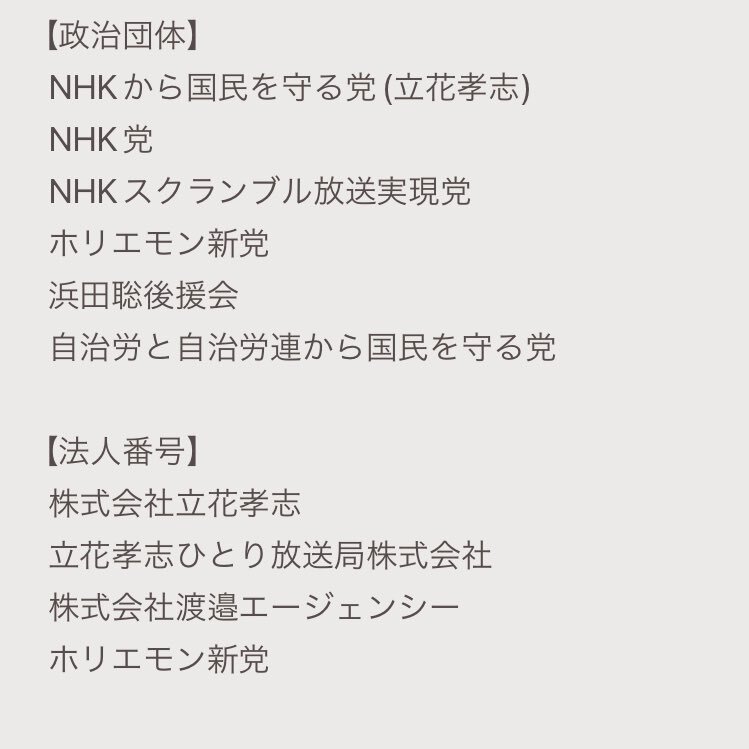 まったくの余談ですが、立花孝志さんやNHK党に関連する政治団体や法人は、「同一住所」でこれだけ登録されていました。 ※参考資料。各政治団体の令和5年収支報告書、自治労と自治労連から国民を守る党サイト、国税庁法人番号公表サイト pic.x.com/zcbt8Z3zug x.com/akiraasami888/…