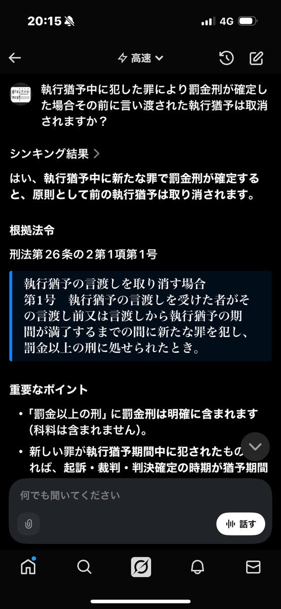 先刻ご指摘があり 刑法26条第二項より 執行猶予後に確定した罰金刑に対する執行猶予取り消しは裁判官裁量である事が判明しましたので必ずしもAIのコメント通りではない可能性ある事を付言します ただしこのケースで裁判官がどのような理由で執行猶予取消ししない「裁量」をするか考えも及びませんが… x.com/rightman_bt/st…