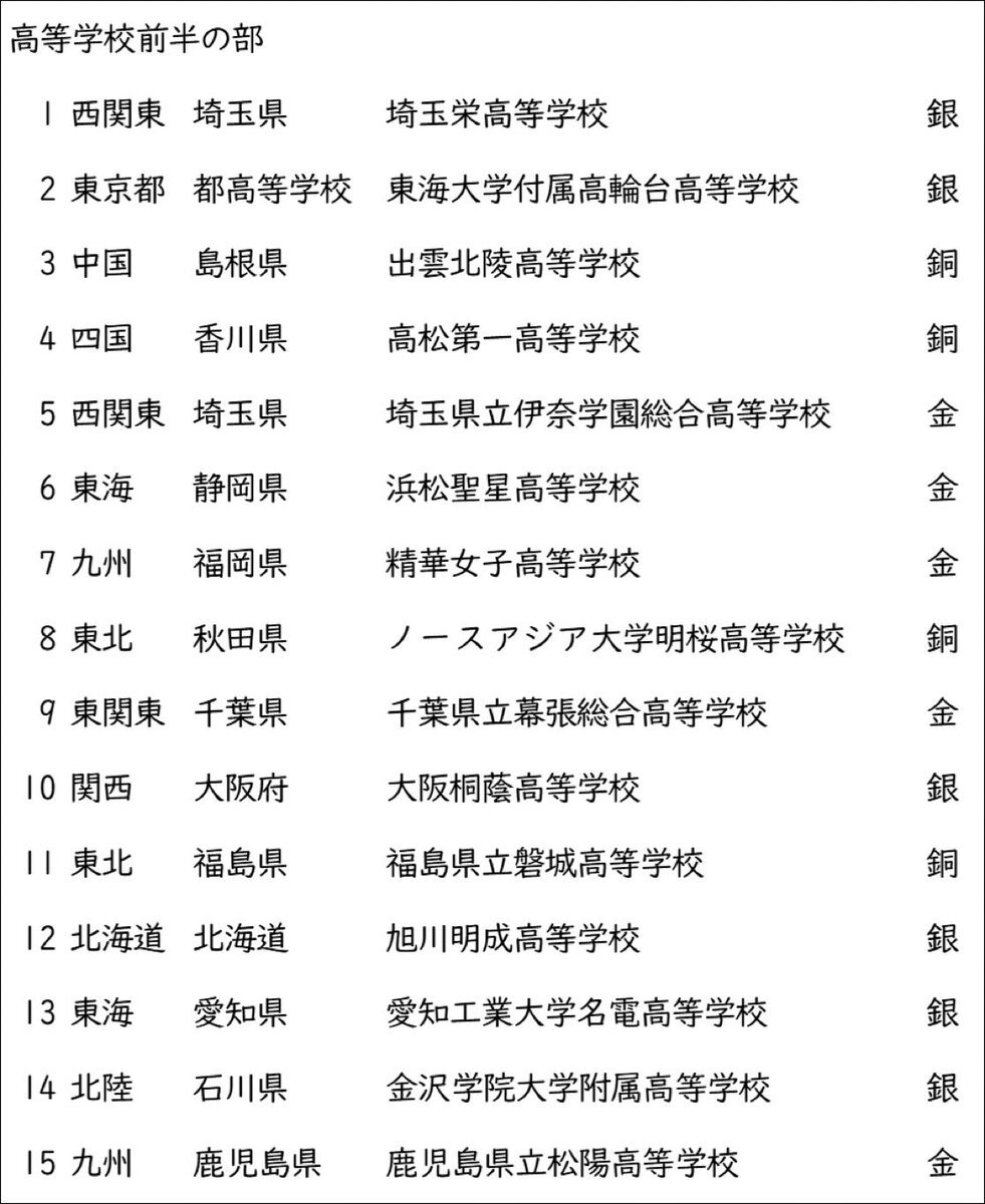 🔴第73回全日本吹奏楽コンクール🔴 🟡高等学校前半の部 審査結果🟡 👑ゴールド金賞👑 👑埼玉県立伊奈学園総合高等学校👑 👑浜松聖星高等学校👑 👑精華女子高等学校👑 👑千葉県立幕張総合高等学校👑 👑鹿児島県立松陽高等学校👑 🥈銀賞🥈 🥈埼玉県埼玉栄高等学校🥈 pic.x.com/JBBj5usvOP x.com/osyhrtllgaszv9…