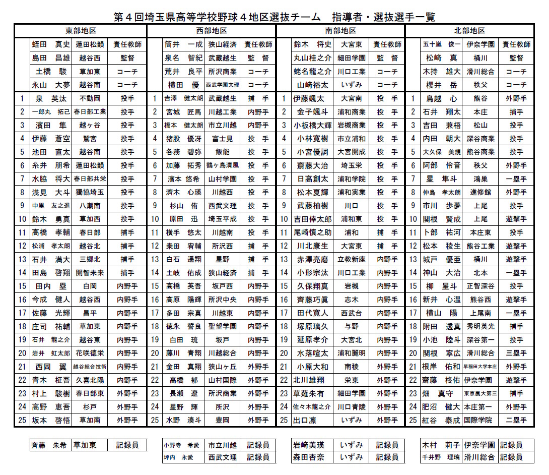 第4回埼玉県高校野球4地区選抜チーム交流戦 上尾市民 東部地区 000 000 010=1 H7 E0 201 000 40x=7 H11 E0 南部地区 試合終了 東:浅見、鈴木、泉、池田、濱田、中里ー田島、石井満 南:齋藤大、吉田、伊藤、松本、金子、小板橋、日高ー川北、尾崎 三 延原、小形(南) 二 尾崎、小板橋(南)浅見(東)