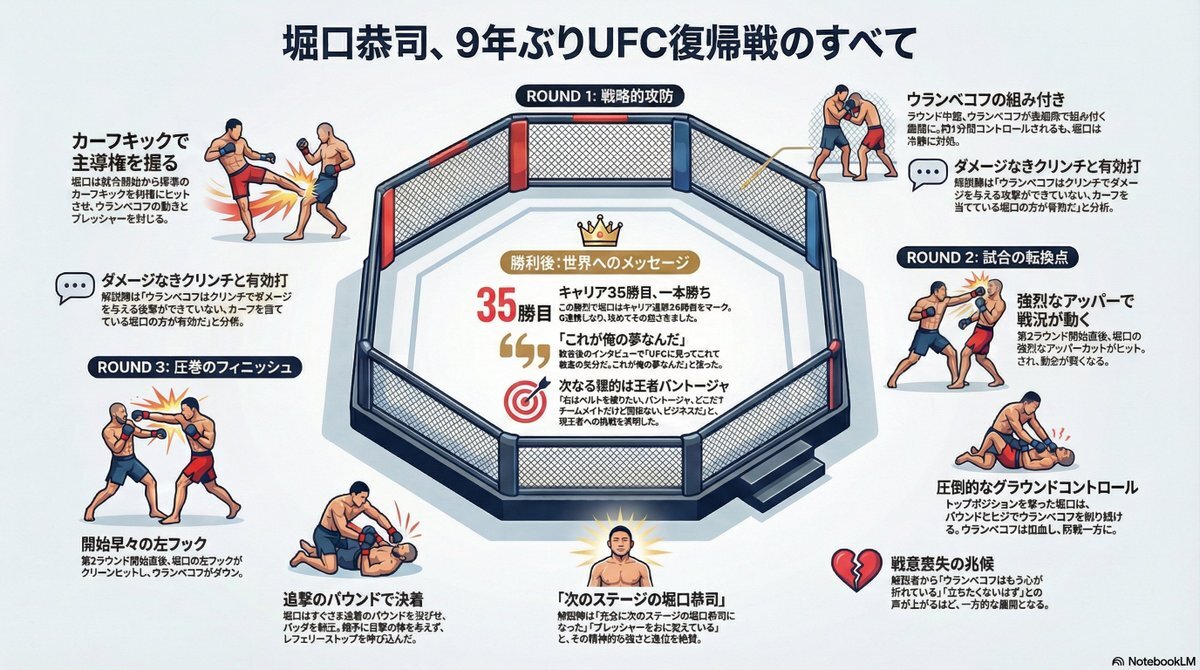 【速報】堀口恭司、9年ぶりUFC復帰戦で完璧フィニッシュ!!! 「I finally came back to the UFC!!!!! Thank you very much. 日本の皆さん、遅い時間まで応援ありがとうございました!!!」 → ランキング6位ウランベコフを3R裸絞めでタップアウト → パフォーマンス・オブ・ザ・ナイト獲得 → x.com/kyoji1012/stat…