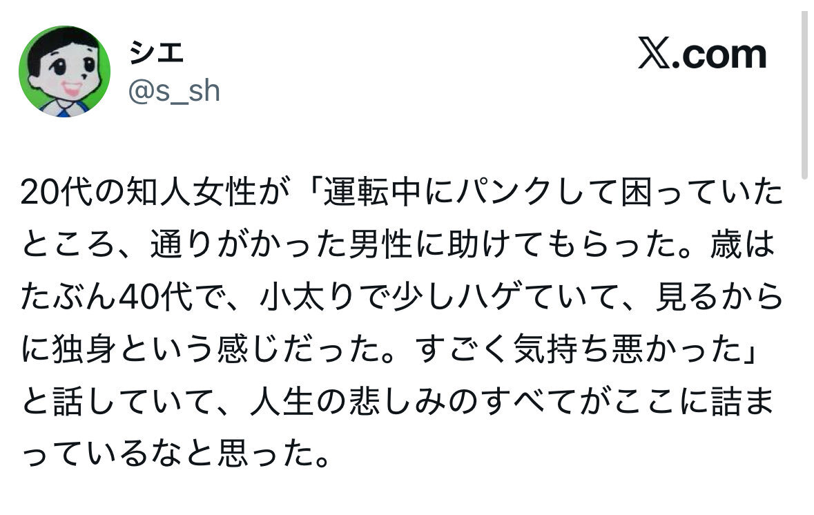 こういう手合いが日本社会を腐らせるんだよ。自分では何もできないくせに、インフラや他者の善意にタダ乗りして、気に入らないと唾を吐く。圧倒的な幼児性と全能感。これは甘えではなく、境界性人格障害に近い病理を感じるね。40代男性の善意を踏みにじるその精神構造こそ、見ていて吐き気がする。 x.com/yamane_ou/stat…