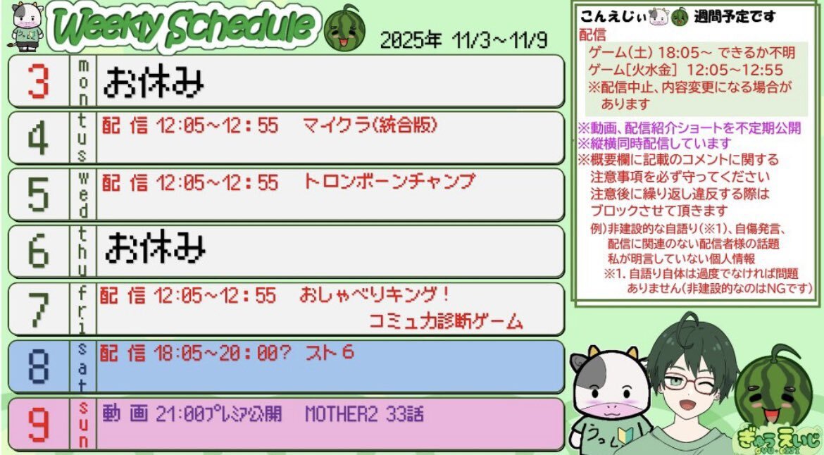 本日の活動予定とお写真です😊 ◼️本日11/9の活動予定 12:00 声マネキング(ショート動画) 20:00 声マネキング(ショート動画) 21:00 マザー2(プレミア公開) ◼️ぎゅうえいじについて 一問一答自己紹介動画を公開しました🙌 ぜひご覧いただき、ぎゅうえいじを知ってください😊 pic.x.com/VT0DmEYPkE