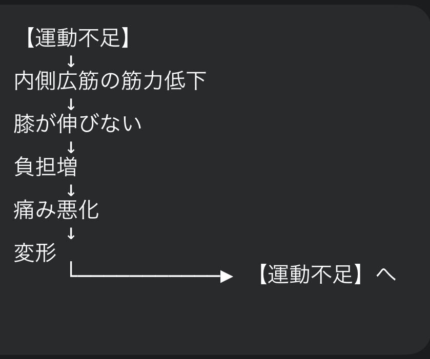 変形性膝関節症の最大の原因は「運動不足」である。特に軽度なものほど膝が伸びないことで痛みの発生。 これは膝を伸ばす役割を持つ内側広筋が細くなるためだ。内側広筋は持久力系の筋肉で細くなりやすい。つまり運動不足によって真っ先に弱化する場所。結果、膝の痛みや変形が進行していく。 pic.x.com/T2cdPL1uCg