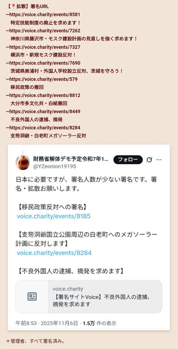 *埋もれないようRT #拡散 スレッド参照 ②x.gd/X4TbM #告知 #移民政策反対デモ #多文化共生 #voice #署名 8件 #移民 #外国人 #クルド #モスク #外国人学校 #特定技能制度 #メガソーラー #集団ストーカー #テクノロジー犯罪 x.com/kan_2023/statu…