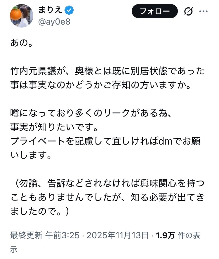 逮捕された立花孝志容疑者(58)の愛人と噂のアカウントは、被害者の竹内元県議が夫人と別居状態にあったか否かを誹謗中傷コンテンツにするよう犬笛を吹き、その背景として「告訴などされなければ興味関心を持つこともありませんでしたが、知る必要が出てきました」と述べている。 これもう証人威迫やろ x.com/ay0e8/status/1…