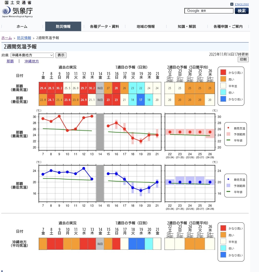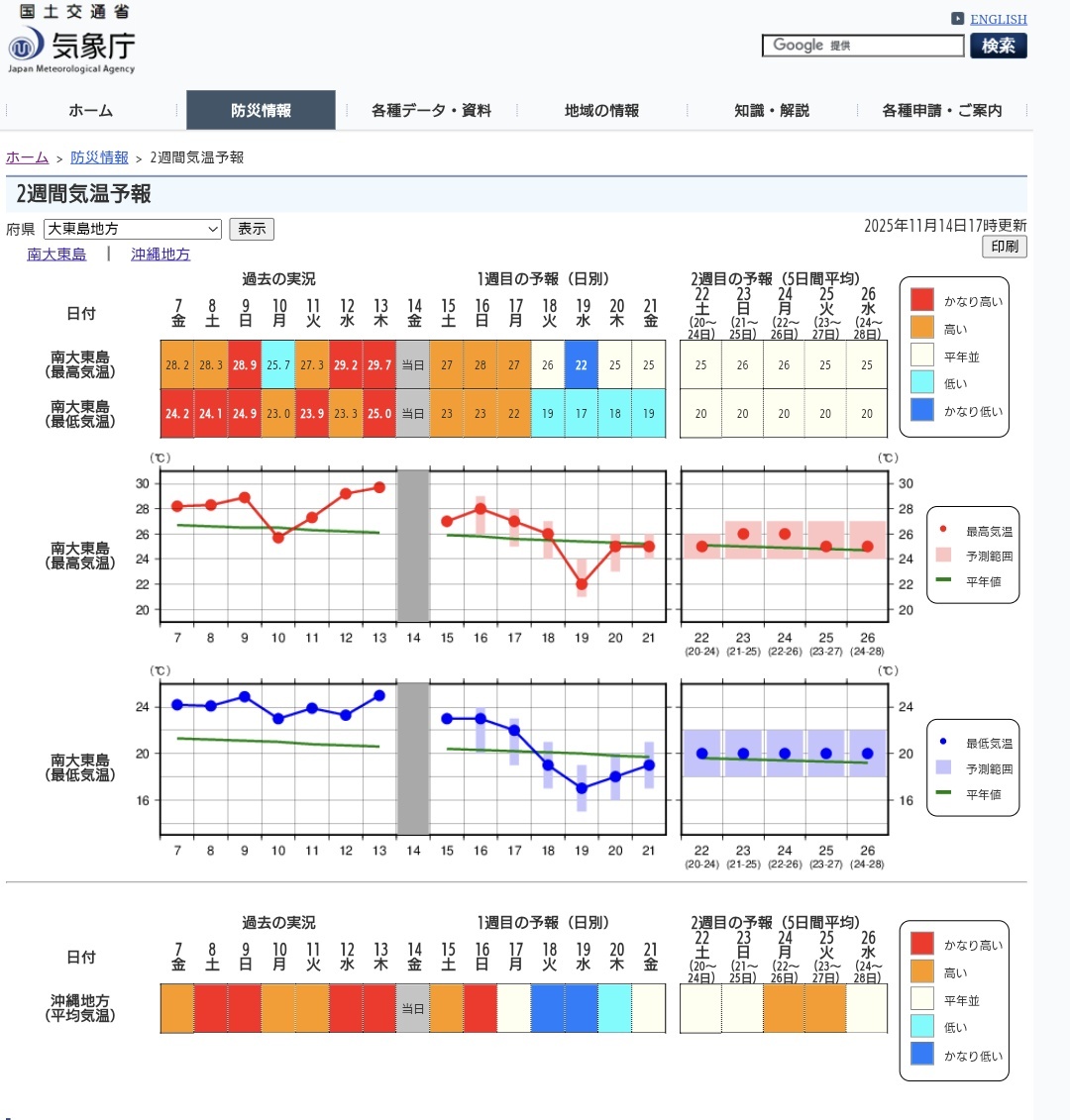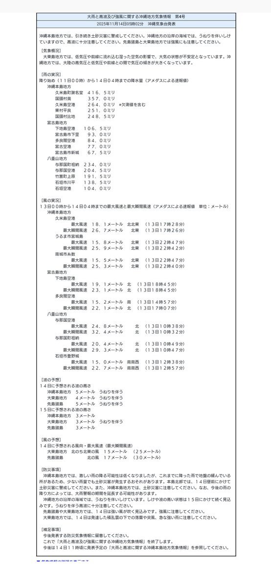 【沖縄地方 気象情報 2025年11月14日 05:02】 沖縄本島地方では、引き続き土砂災害に警戒してください。沖縄地方の沿岸の海域では、うねりを伴いしけていますので、高波に十分注意してください。先島諸島と大東島地方では強風にも注意してください。