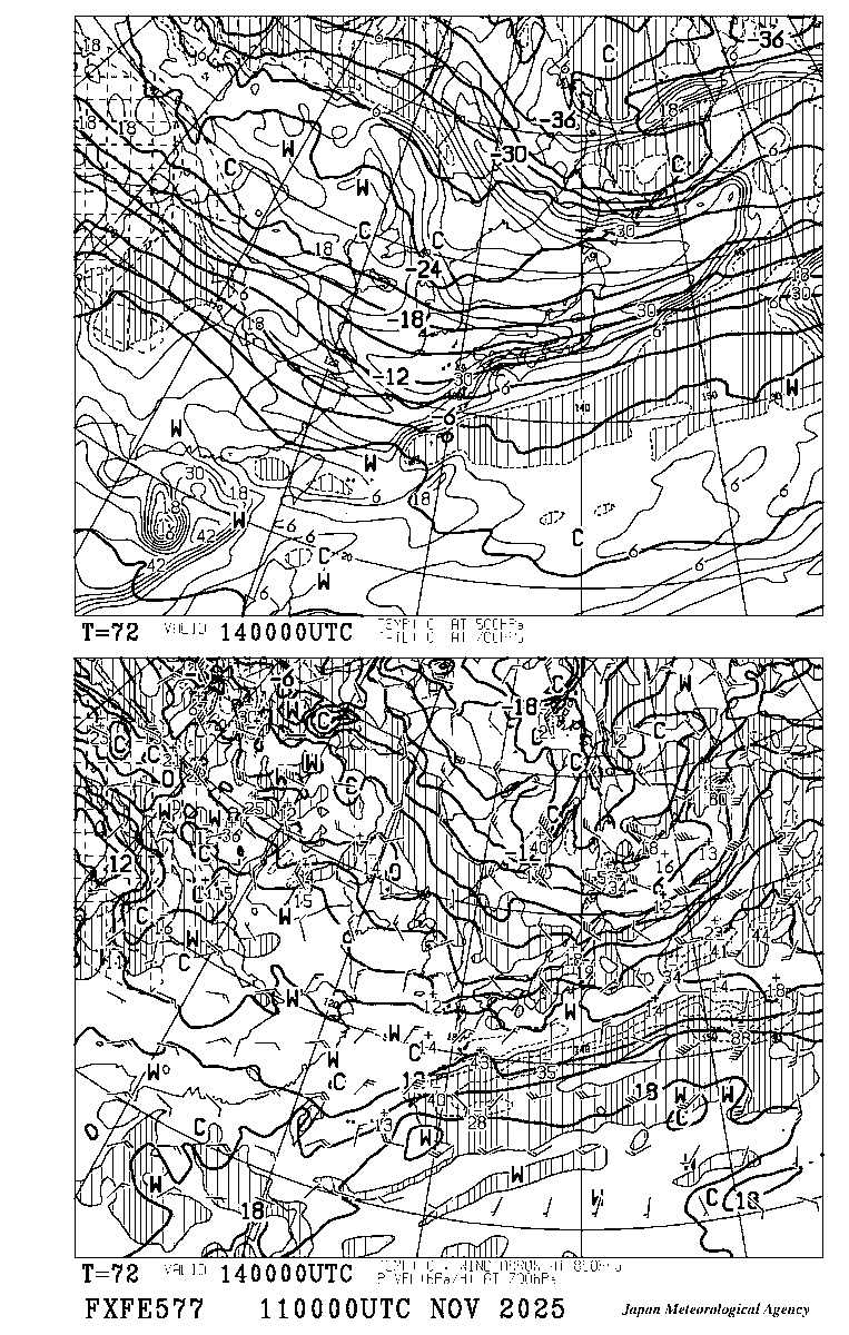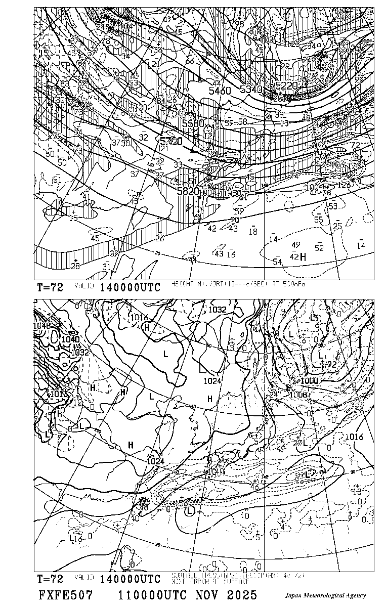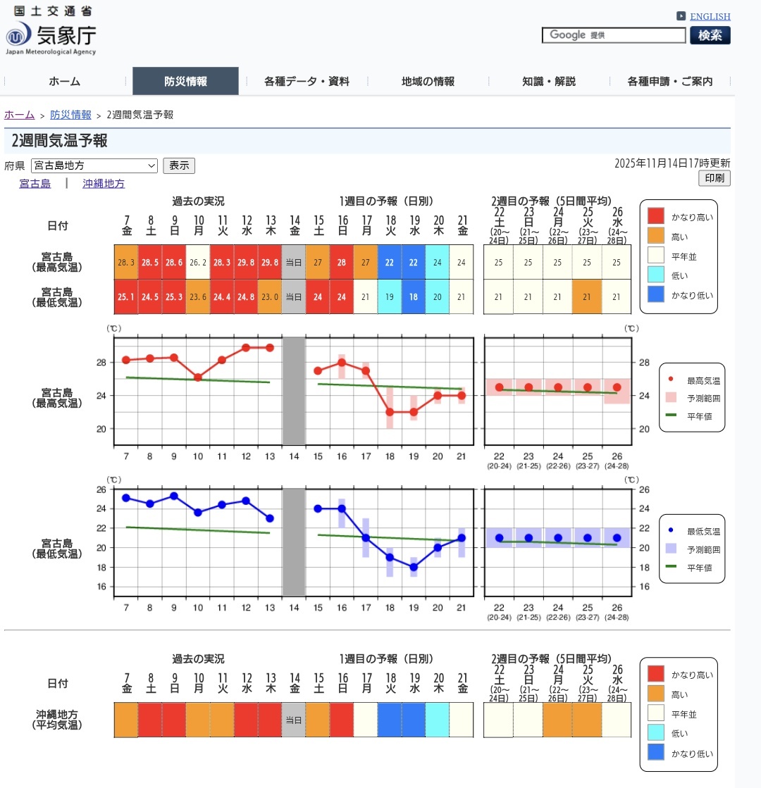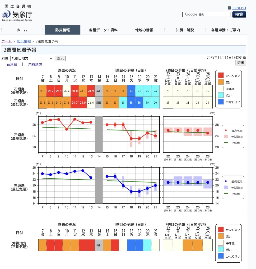 【沖縄地方 気象情報 2025年11月14日 05:02】 沖縄本島地方では、引き続き土砂災害に警戒してください。沖縄地方の沿岸の海域では、うねりを伴いしけていますので、高波に十分注意してください。先島諸島と大東島地方では強風にも注意してください。