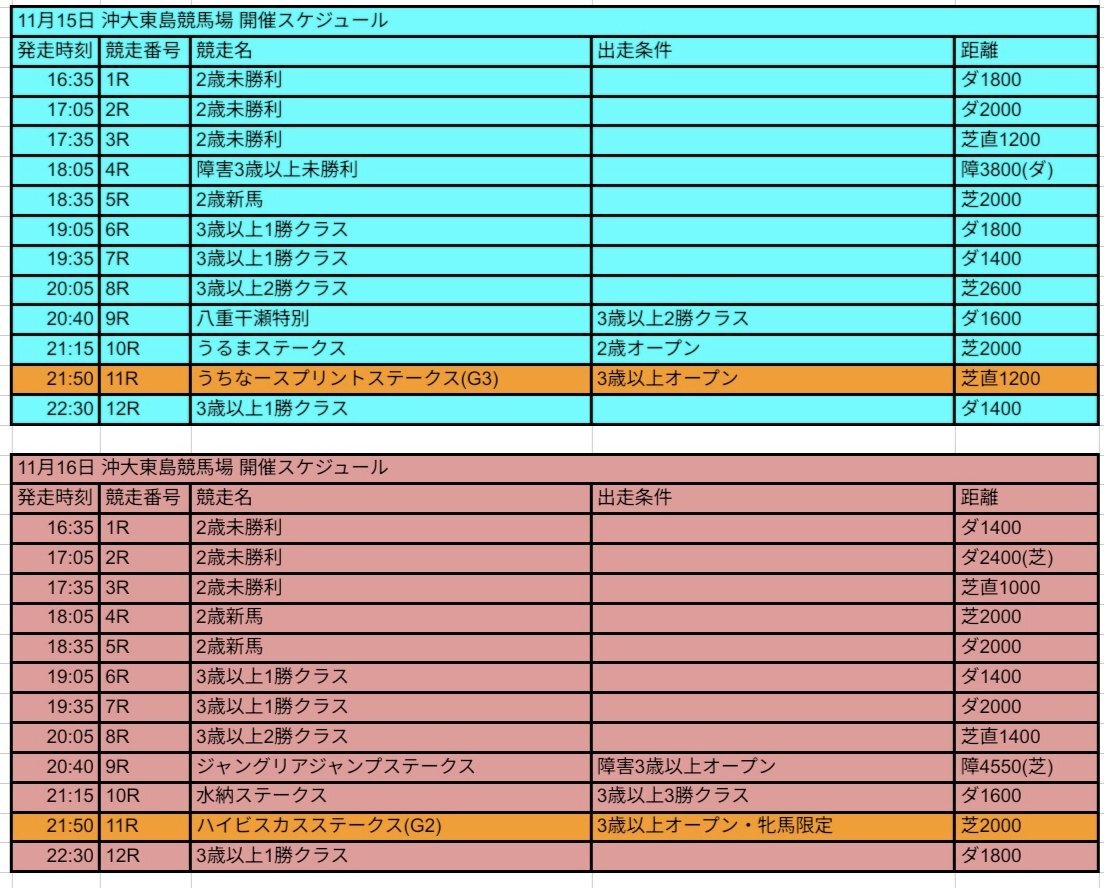 【沖大東島競馬場】 今週の重賞競走 土曜11R うちなースプリントステークス(G3) 日曜11R ハイビスカスステークス(G2) テキストのみですが出馬表です。 発走はそれぞれ21時50分の予定です。 pic.x.com/gqASftQXyo