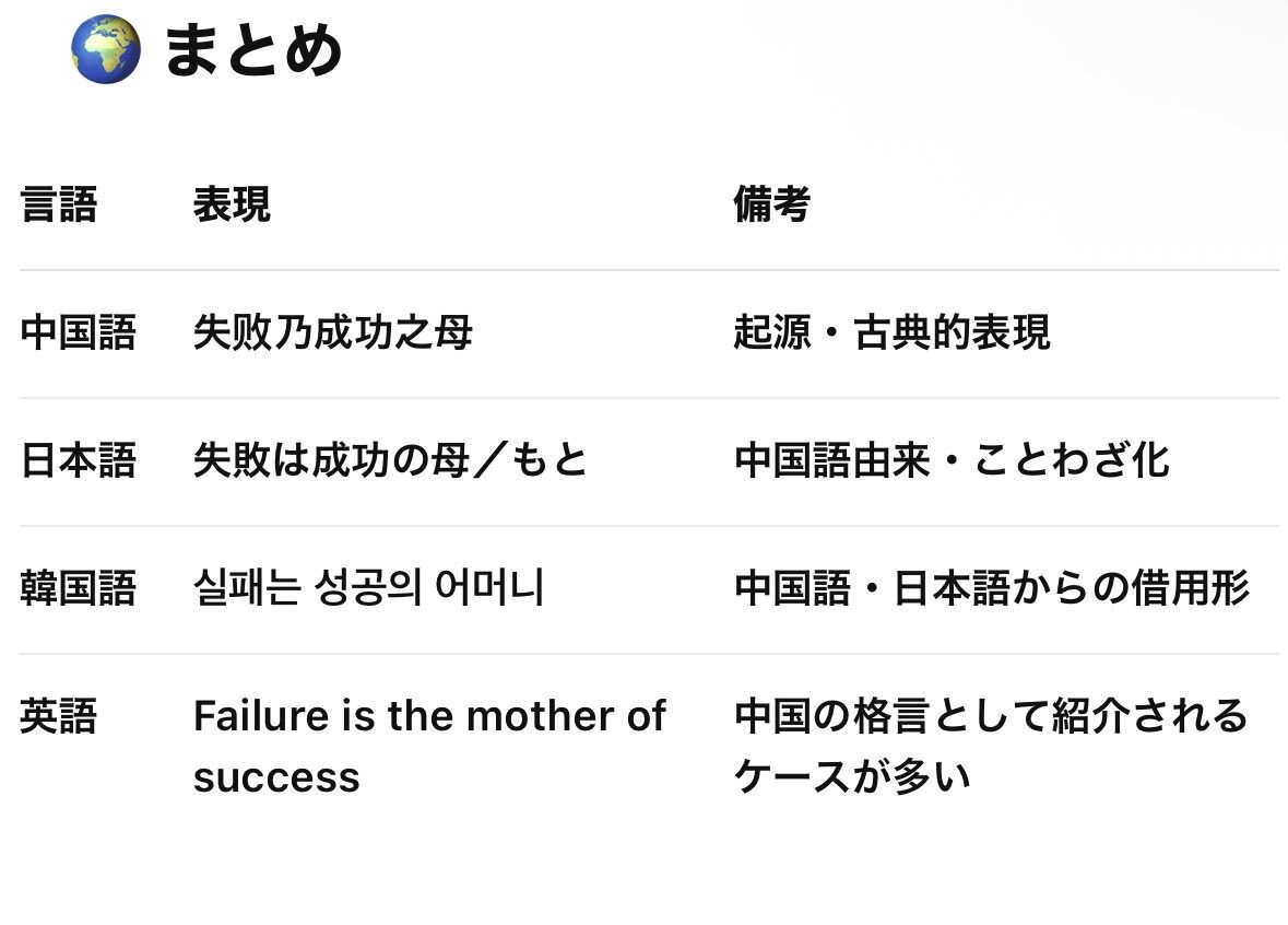 消えちゃったんだけどさっき日本でも「失敗は成功の母」とも言うと教えて下さった方がいてもうちょっと調べてみたら母を使うのは東アジア的な比喩表現らしい 英語では違う表現だけどmotherを使うこともあってその場合は中国の格言の翻訳だと pic.x.com/MIrGhLJmRp