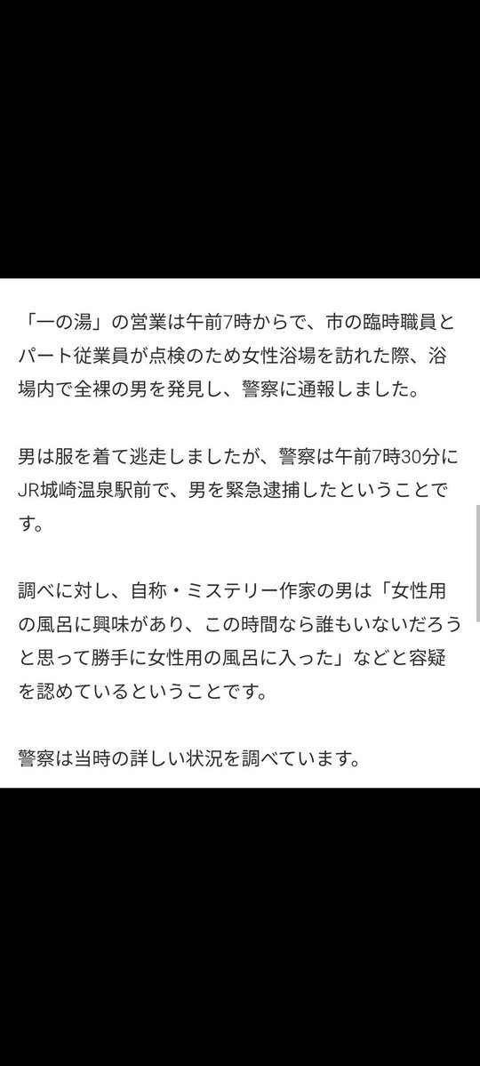 【通報】自称・ミステリー作家を緊急逮捕、女性用浴場で全裸姿で見つかる 兵庫県・城崎温泉 news.livedoor.com/article/detail… 調べに対し、容疑者は「女性用の風呂に興味があり、この時間なら誰もいないだろうと思って勝手に女性用の風呂に入った」などと容疑を認めているという。