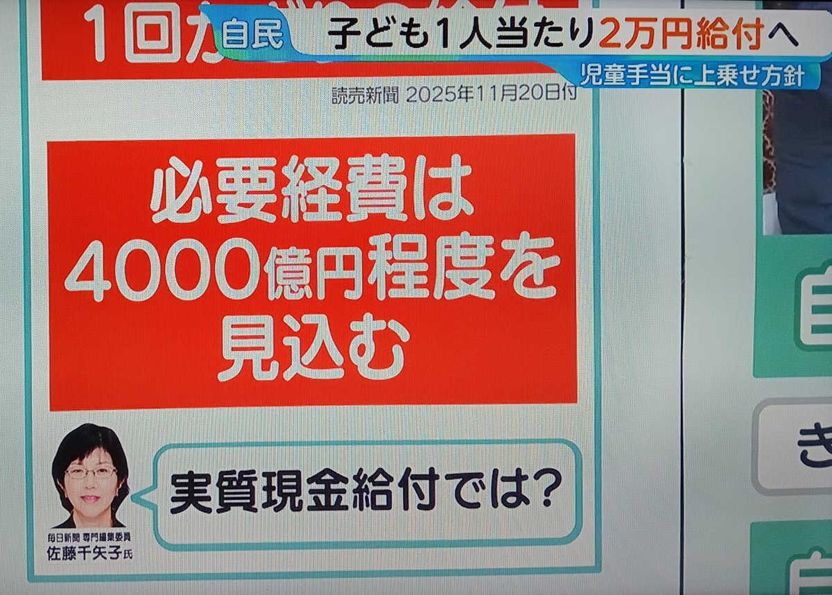 倉田真由美さん ネット騒然の「子供1人当たり2万円給付」に私見「子どもがいる家庭を極端に優遇…大きな分断を生みかねない」(スポーツ報知) #Yahooニュース news.yahoo.co.jp/articles/34e49… ん?これって石破時代の残骸法案じゃないの?無くせんかったのか…