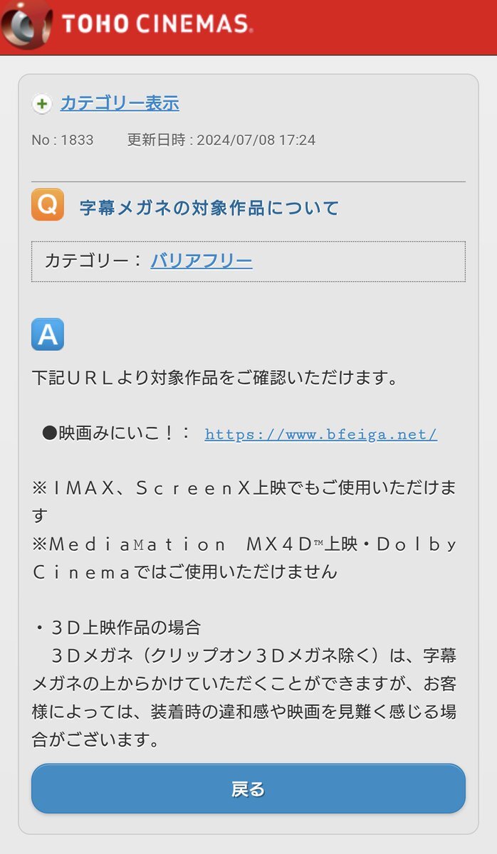 字幕メガネ、TOHOシネマズのQ&AだとやっぱりMX4Dでは使えない(壊れるもんね…)4DXでもだめでしょうね あとDolbyCinemaでも使えないって書いてあってこれは驚き ドルビーで字幕メガネを使った時に認識がうまくいかないな〜と思ってたのはやっぱりその辺何かあるのかな… pic.x.com/1NqFMs4JLq x.com/himugashino/st…