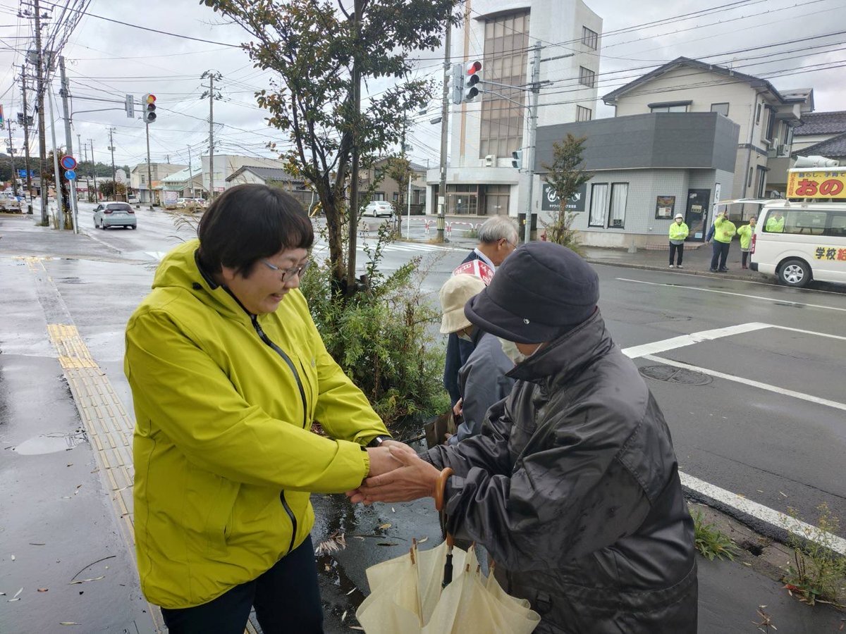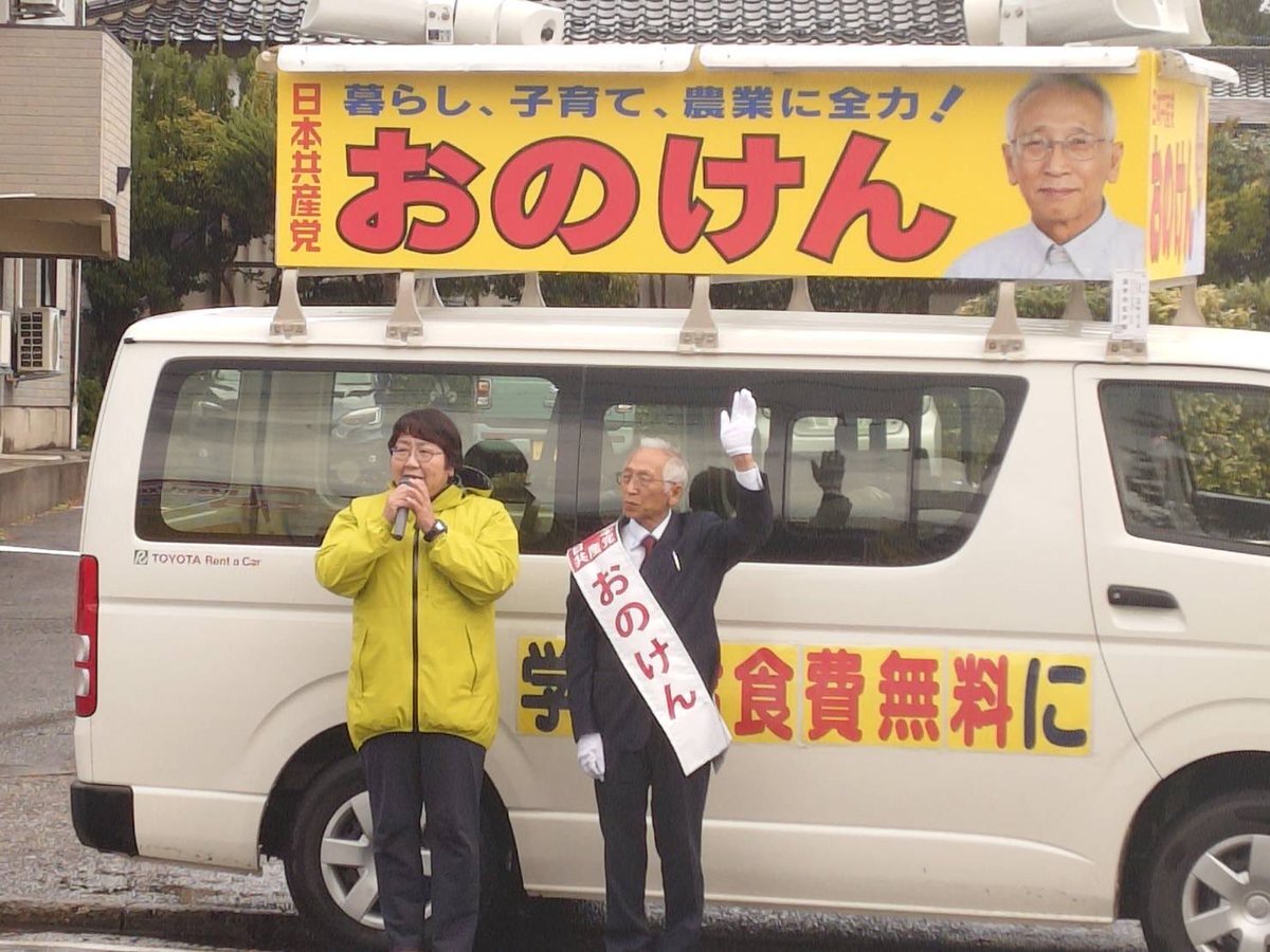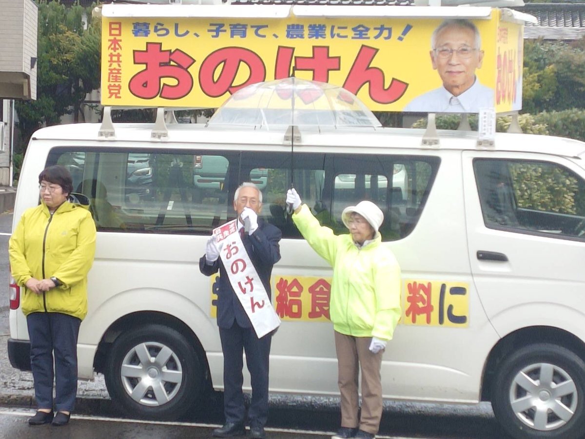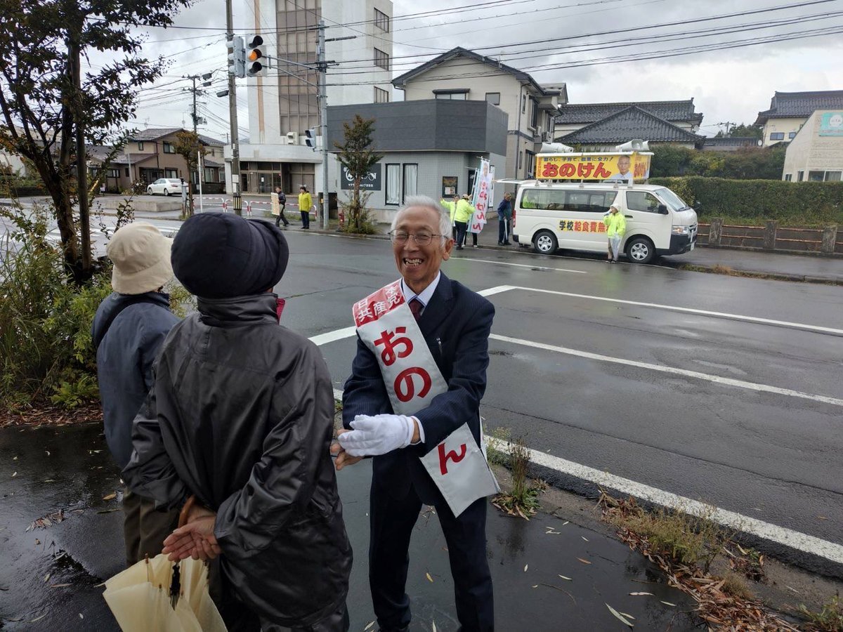雨降りでしたが、選挙戦真っ最中の秋田県 #由利本荘市議選 に #おのけん 候補の応援!8期30年つとめた佐々木隆一さんの議席を必ず引き継がせてください!若いお母さんから学校給食無償化をなんとか、といわれた。高校生の通学代高すぎて補助したい、財源もある、とリアルに語るおのけん。 pic.x.com/tb1nqua5Mi