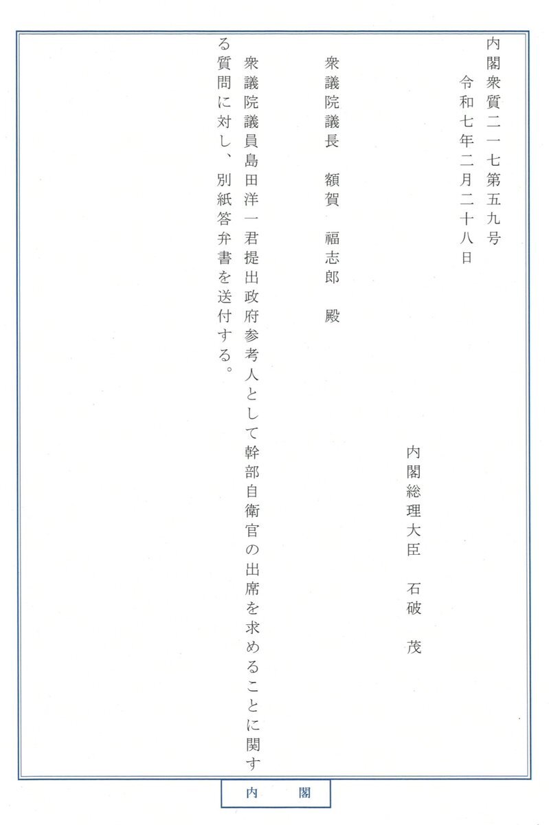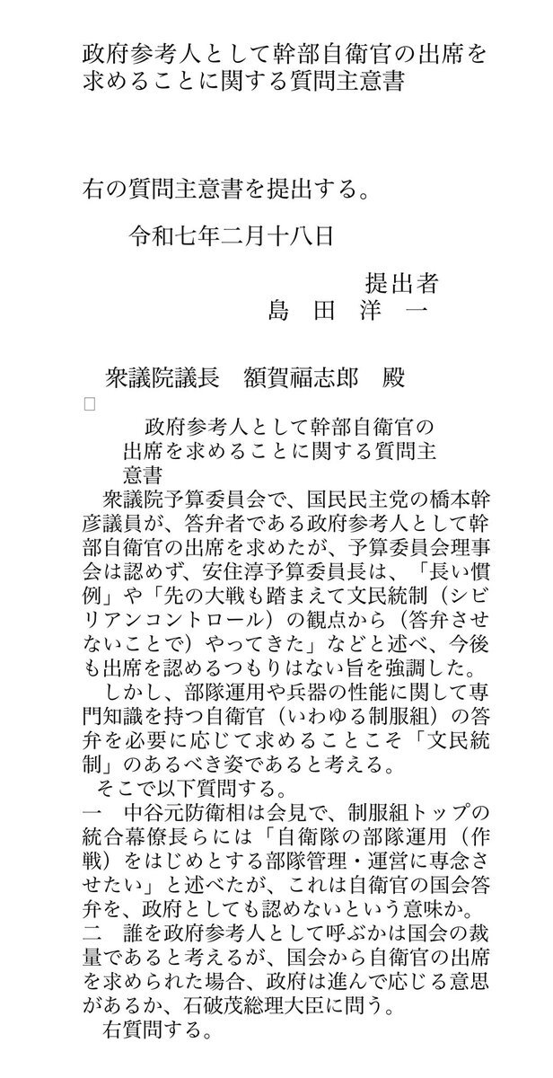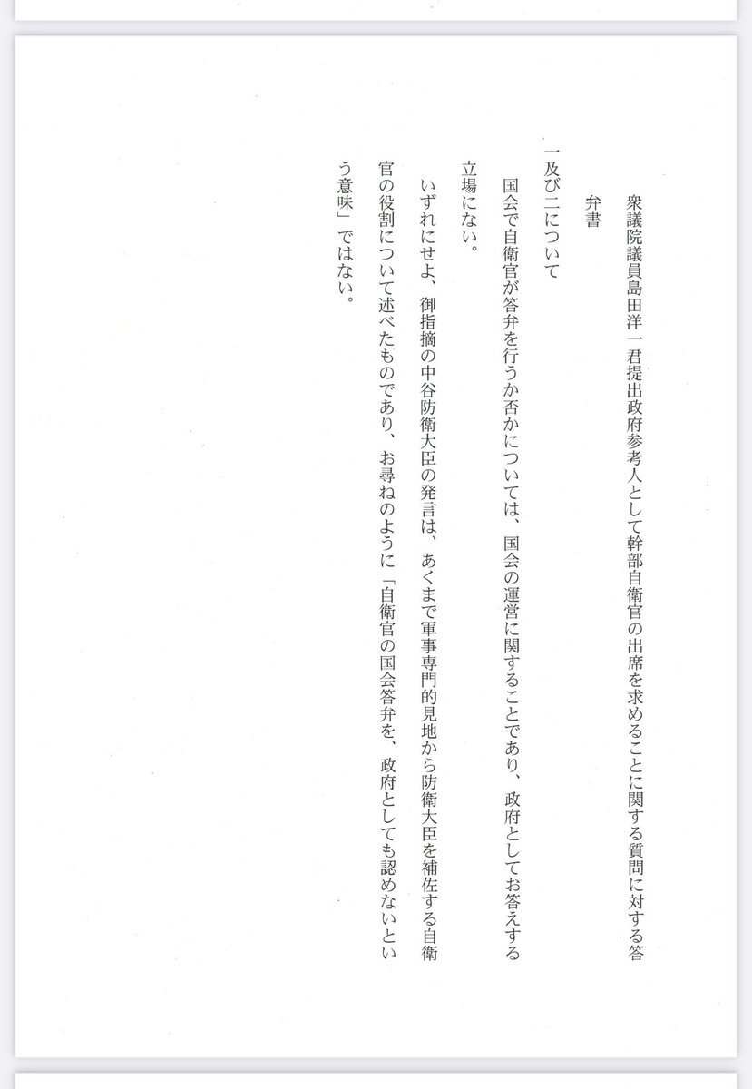 自衛官に、参考人としての国会答弁を認めるべきとした私の質問主意書に政府からの回答書が来た。 要するに、国会からの要請があれば自衛官の国会答弁に応じるということだ。 問題は、認めるべきでないとする安住淳衆院予算委員長ら政治家の側の不見識にある。 pic.x.com/OYKo7ODtNt