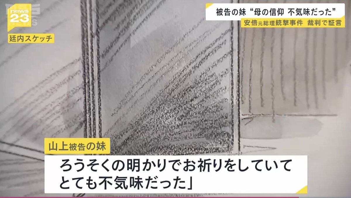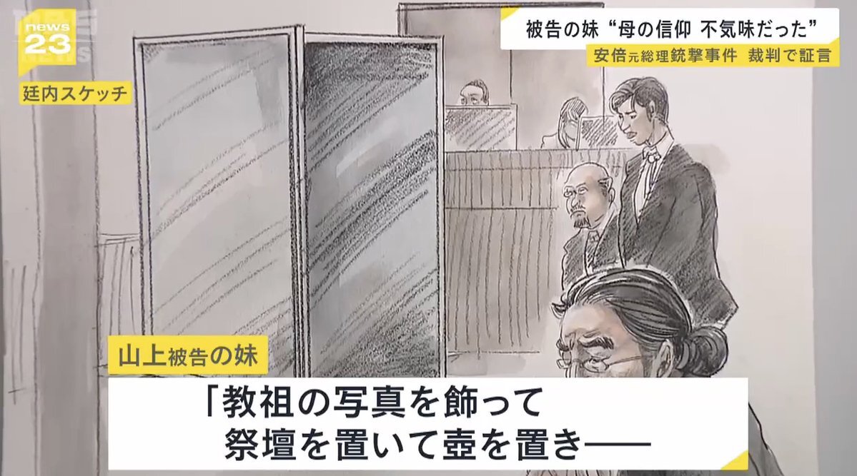 安倍晋三銃撃事件で殺人罪などに問われた山上徹也被告の裁判員裁判第9回公判(19日、奈良地裁)。被告の妹が証人尋問で「母の皮を被った信者が母のふりをしていると思った」「私たちは統一教会に家庭を破壊された」と 47news.jp/13478468.html ↓画像はMBSニュースから pic.x.com/k25APEmLWa