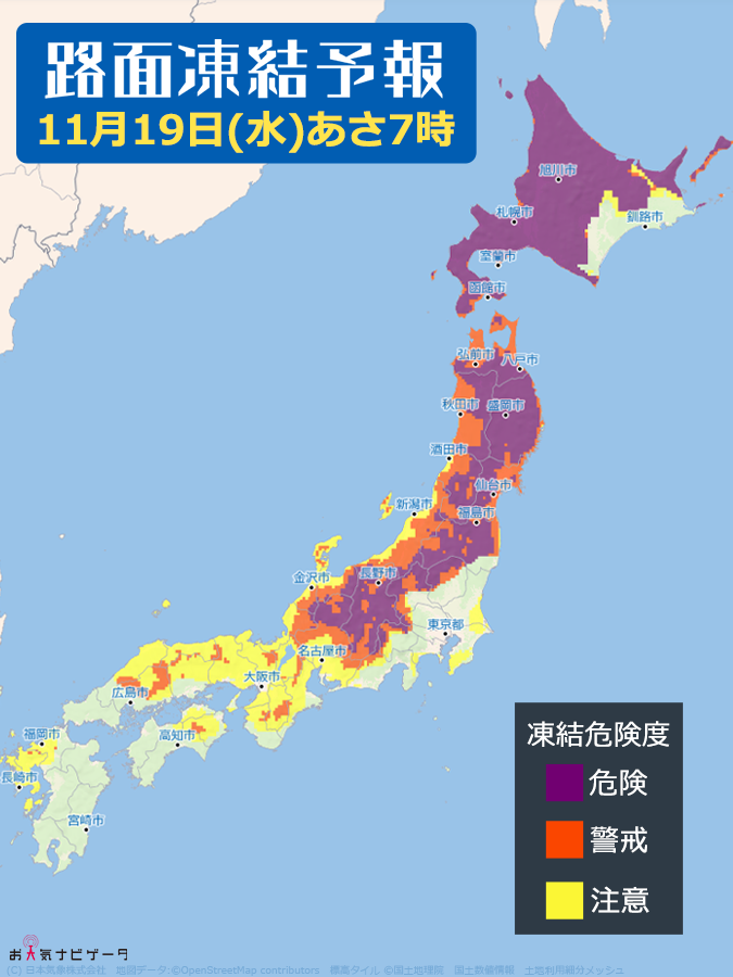 🧊あす朝 路面の凍結に警戒🚨 日本付近は冬型の気圧配置となり あすの朝は厳しい冷え込みとなるでしょう🥶 北海道や東北~甲信越の山沿いを中心に 紫色の危険エリアとなり、 路面の凍結発生の可能性が 極めて高くなります🚨 車の運転は冬の装備で いつも以上に 安全運転を心がけましょう🚗 pic.x.com/iL2tMSZ0HE