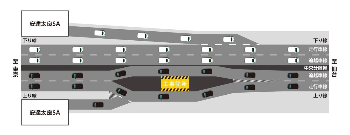 🚧ご注意ください🚧 東北道 本宮IC~二本松IC間の安達太良SA付近のリニューアル工事に伴い、車線シフト規制を実施中です。 走行中は標識・路面表示に十分ご注意いただき、速度を控えめに、安全運転をお願いいたします。 皆さまのご理解とご協力をよろしくお願いいたします。 #NEXCO東日本 #東北道 pic.x.com/BC2dv5k9Eg