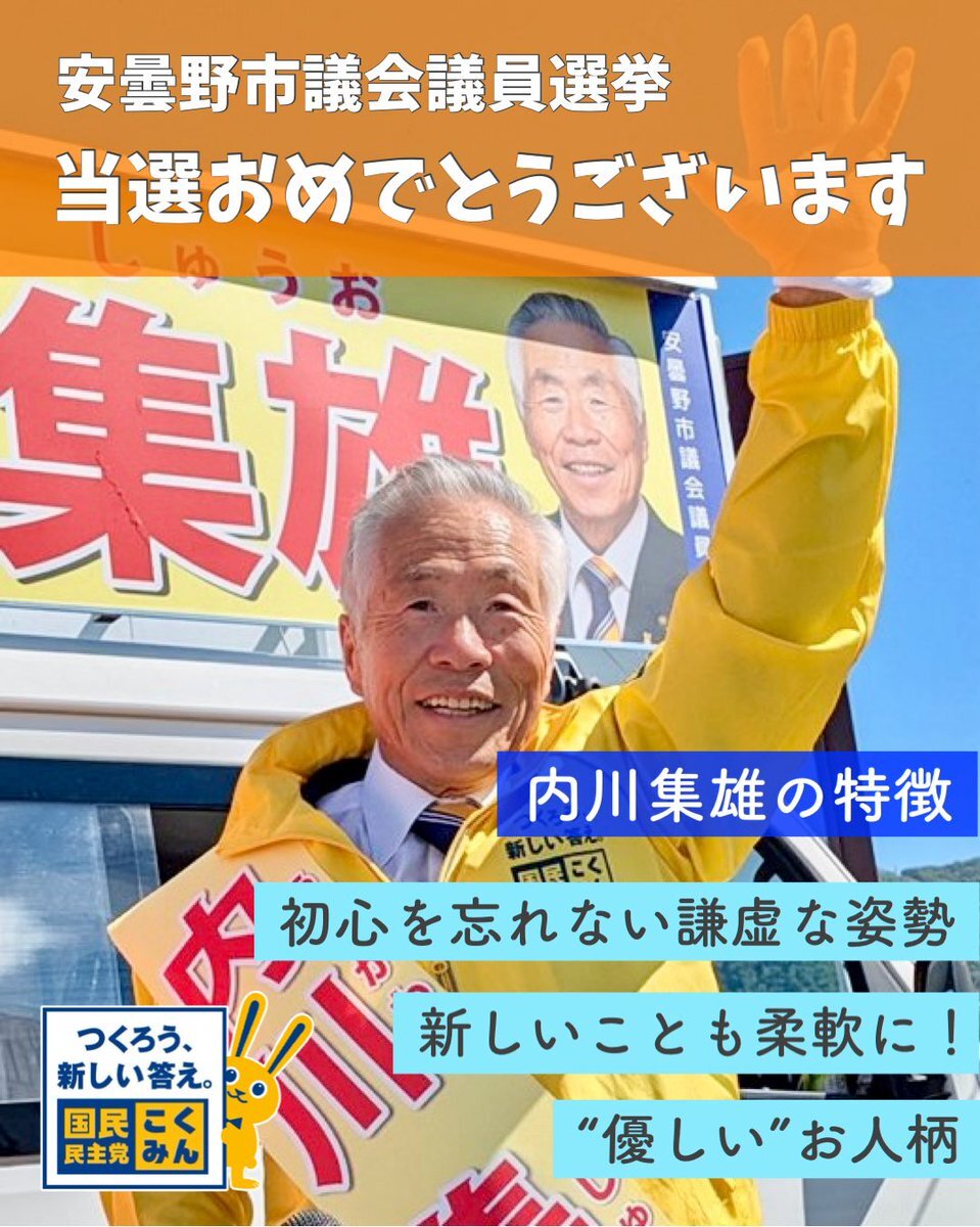 昨日の長野県 #安曇野市議会議員選挙 にて、#国民民主党 公認の #内川集雄 候補が当選いたしました。 X上で選挙活動にご協力いただきましたすべての皆様と選挙期間中お世話になった地域の皆様に心から御礼申し上げます。 これからも学生部長野県支部として内川議員の活動をサポートしてまいります!