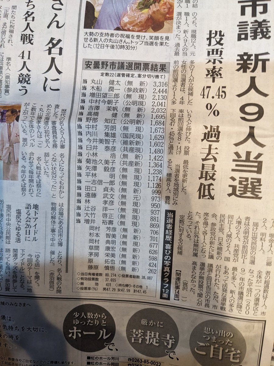 数週間前の安曇野市議会議員選挙。 三郷・堀金・豊科・穂高・明科の旧町村でも議員の数に格差があるとの指摘もあった。結果として、議員が極めて少ない明科地区で票が1人に集中してトップ当選 大部分の議員は会派を組まないというニュースも見た #市民タイムス pic.x.com/DwOswyrZvf