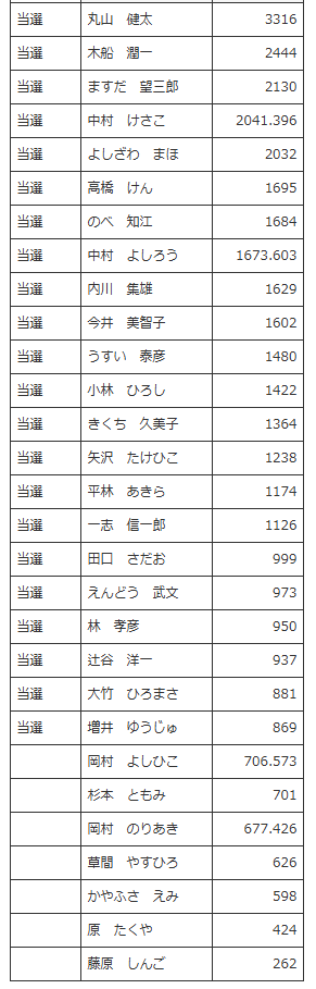 自分用メモ 安曇野市議会議員選挙 落選者 岡村(よ) 岡村(の) →政策、経歴ともに良さそうだったが 表が割れたか? 杉本 →選挙カーなし、街頭演説のみとのことだが肝心の街頭演説で支援者と雑談ばかりしていて残念。 草間 →元芸能事務所所属。市議会議員は芸能人の再就職先ではない。