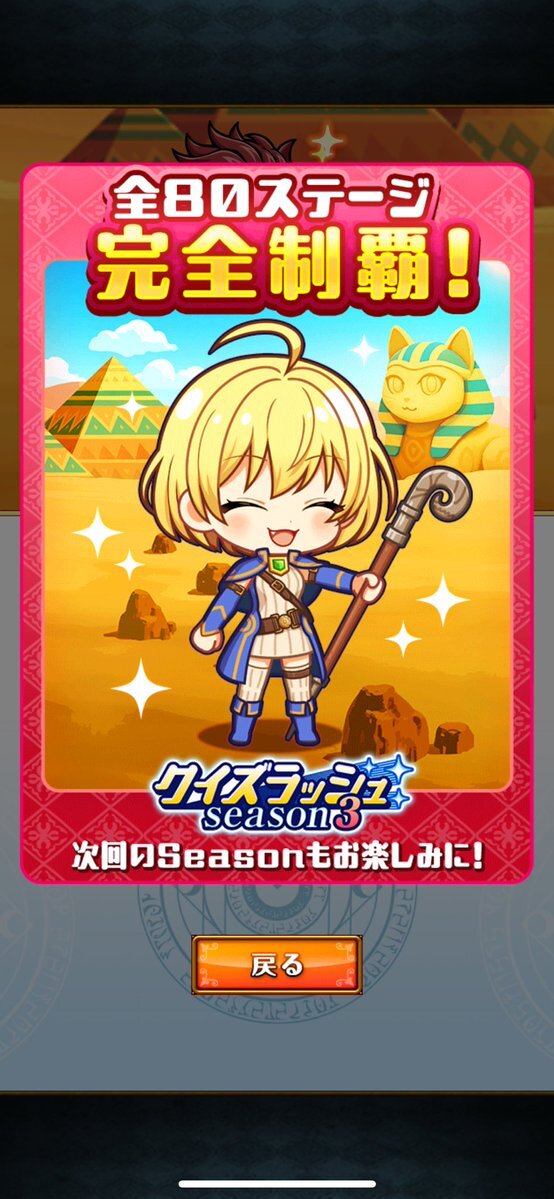 そしてクイズラッシュseason3、超駆け込みで完全制覇しました!!!レベル285でもなんとかなった☺️危なかったですが、今回もギリギリクリア😌 #クイズRPG魔法使いと黒猫のウィズ #黒ウィズ #クイズラッシュ #season3 pic.x.com/VnS1k7tzTg