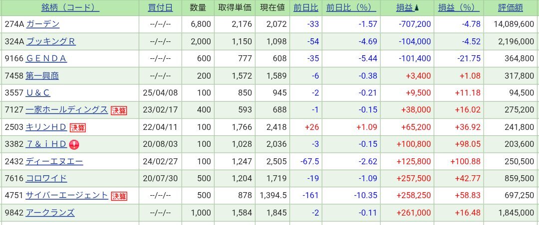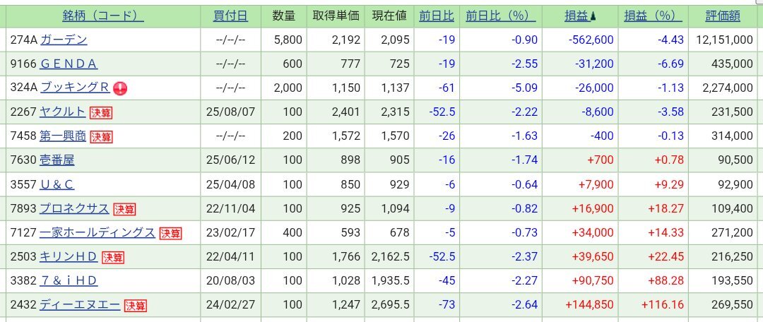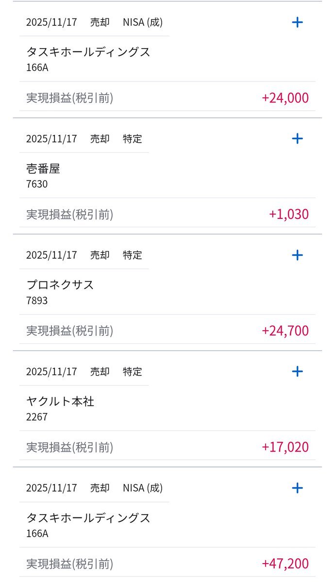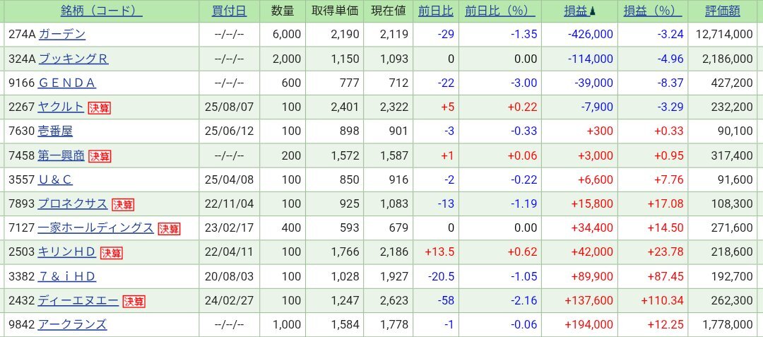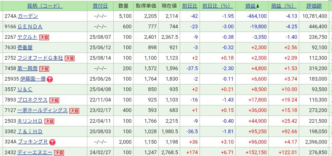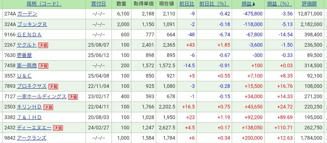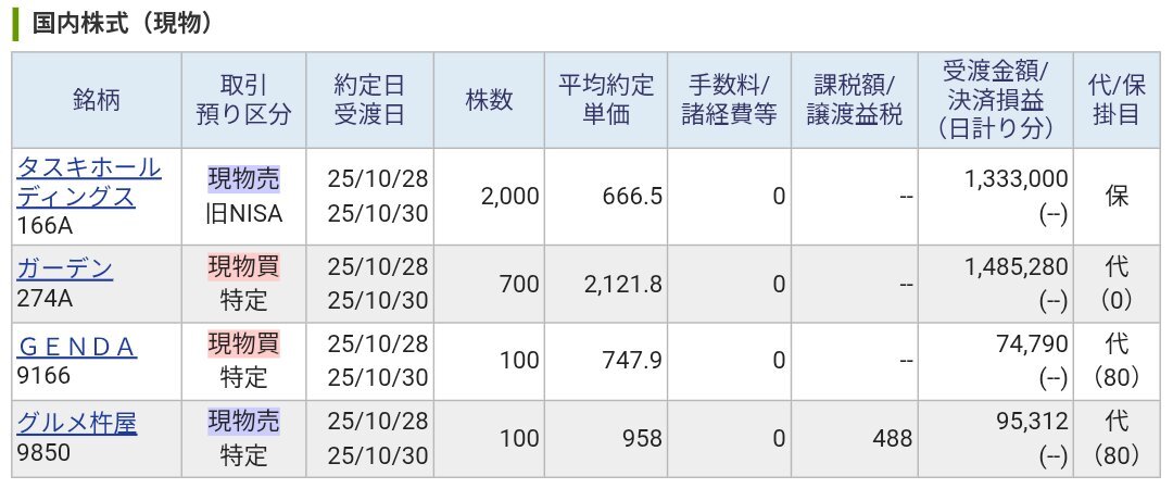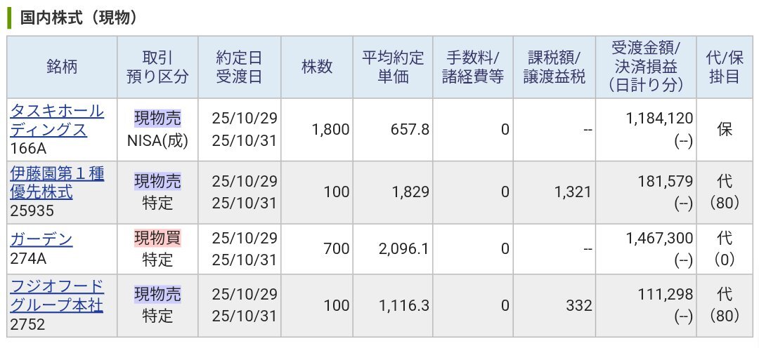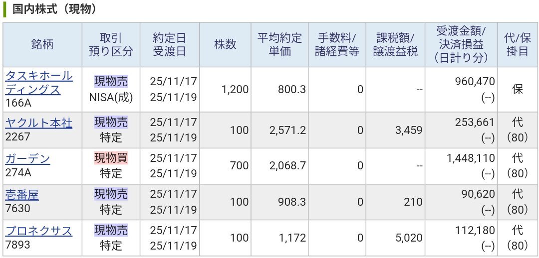 タスキHD(新NISA)800.3円で1200株売却 全利確 実現損益(税引前)+287270円 ヤクルト2571.2円×100株売却 実現損益(税引前)+17020円 ガーデン2068.7円×700株購入 6100株→6800株 平均取得単価2176円 壱番屋908.3×100売却 実現損益(税引前)+1030円 プロネクサス1172円×100株売却 実現損益(税引前)+24700円 pic.x.com/guM6ucVjUV