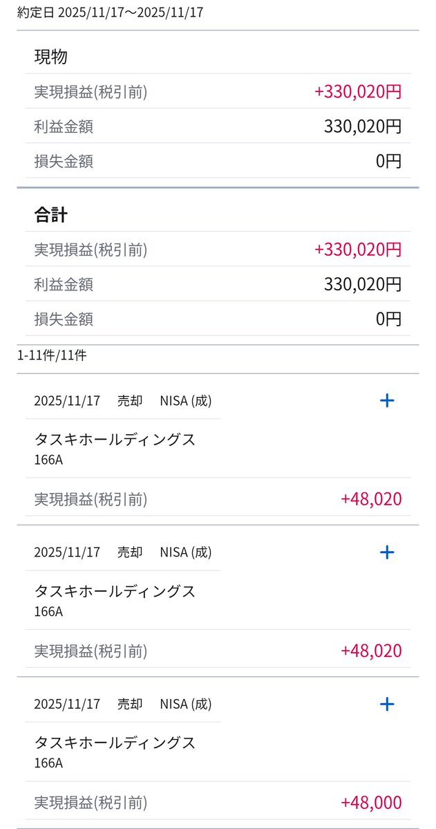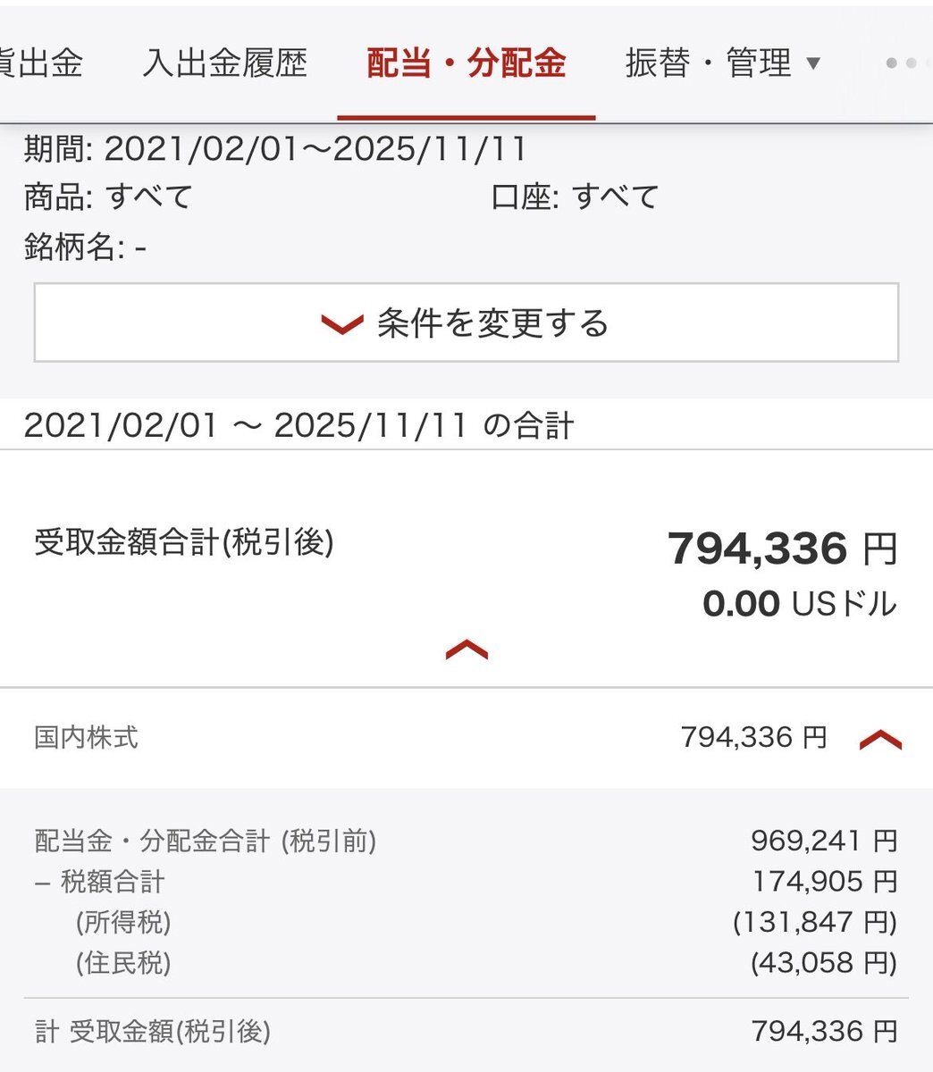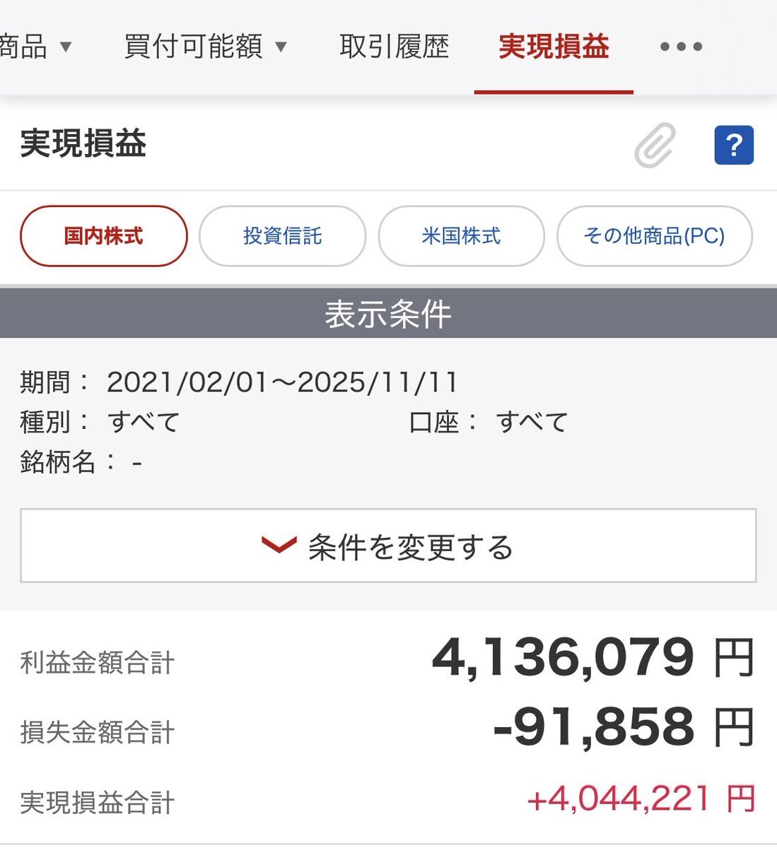 今日の利確で 楽天証券での通算成績が500万円突破🎉✨ 2021/02/01〜2025/11/11 実現損益:4,044,221円 配当金:969,241円 合計:50,13,462円 ※税引前 pic.x.com/Cd90ZKynxO