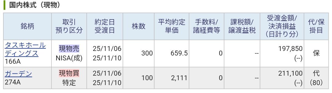 タスキHD(新NISA)659.5円で300株売却 実現損益(税引前)+29550円 ガーデン2111円で100株ナンピン 6000株→6100株 平均取得単価2188円 pic.x.com/wzyVgAQP5O